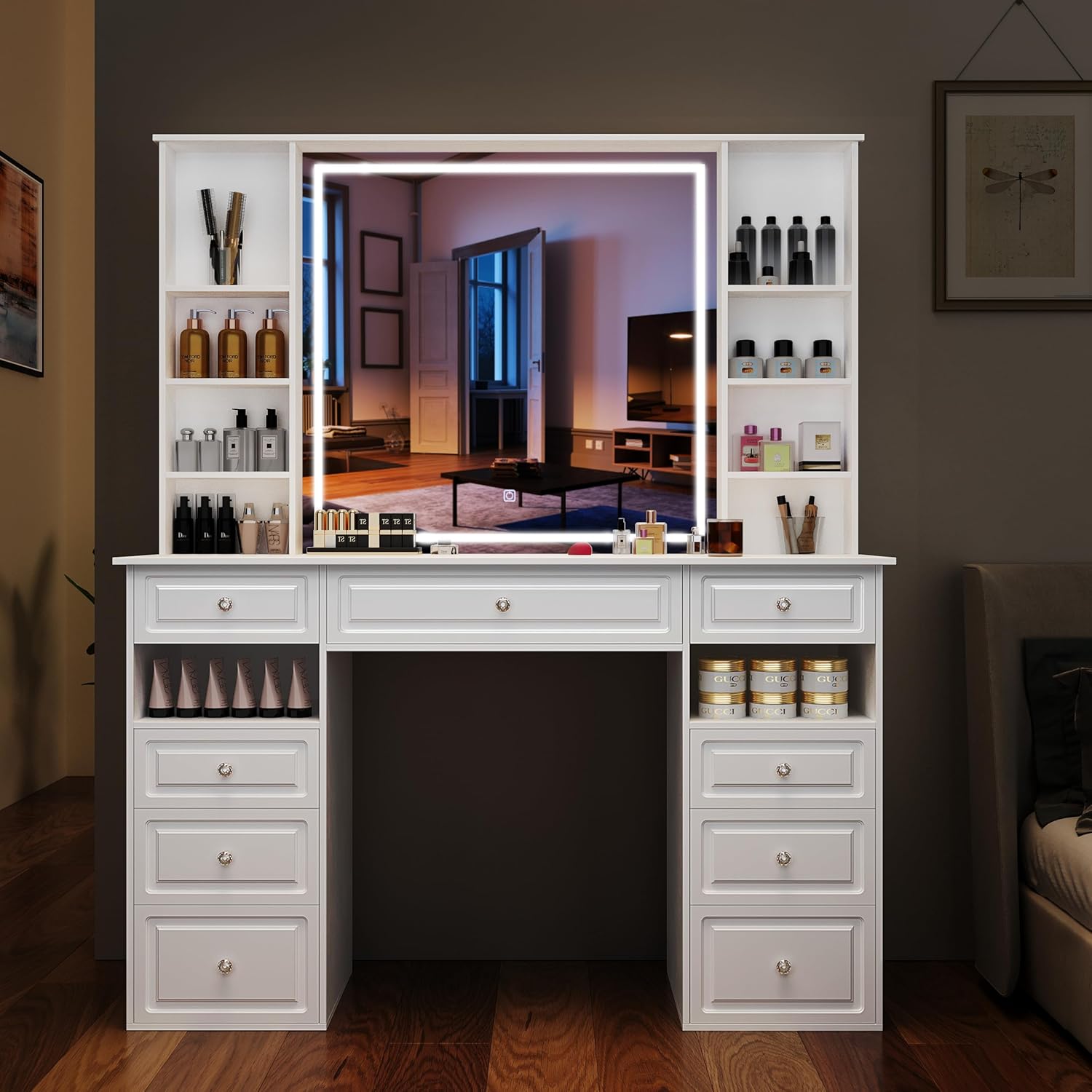 Wildhome makeup vanity has a ton of storage, for giving you a large mirror with excellent makeup view without sacrificing storage space, Wildhome has carefully designed 9 wrap-around drawers, pairing with the roomy tabletop & long storage shelf, holding as much as you have!