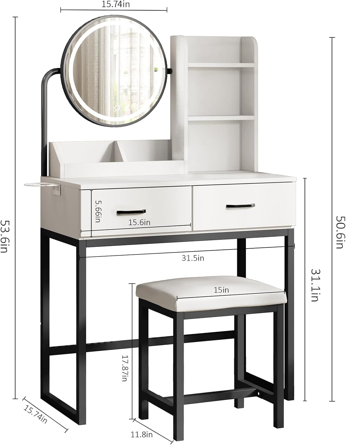 Package Content:1 x Dressing Table, 1 x Round Mirror with LED light, 1 x Cushioned Stool, 1 x Accessories, 1 x Hair Dryer Rack, 1 x Instruction.