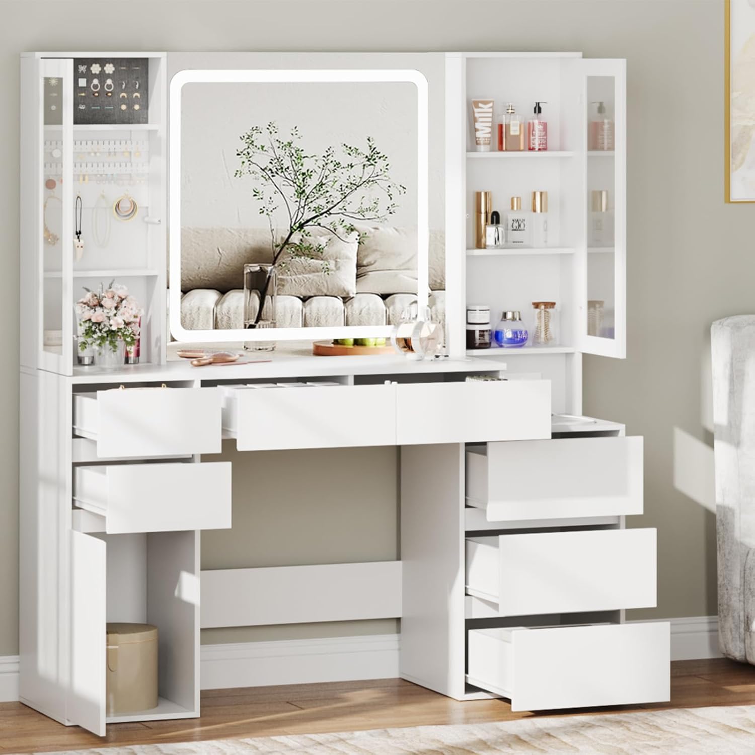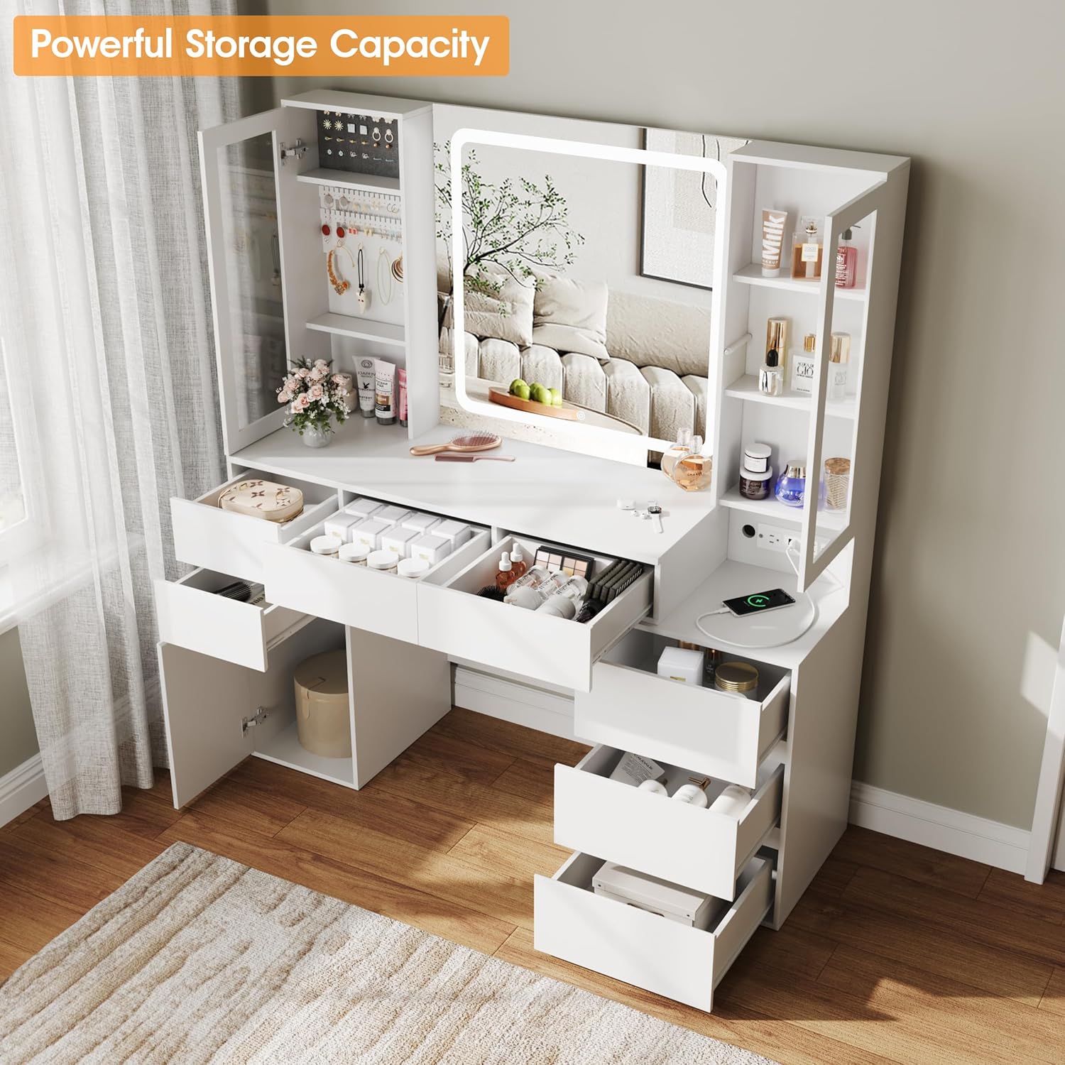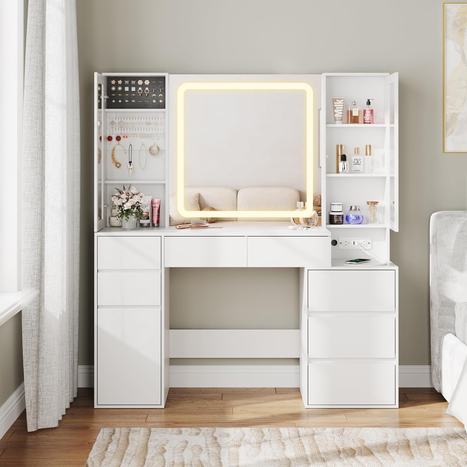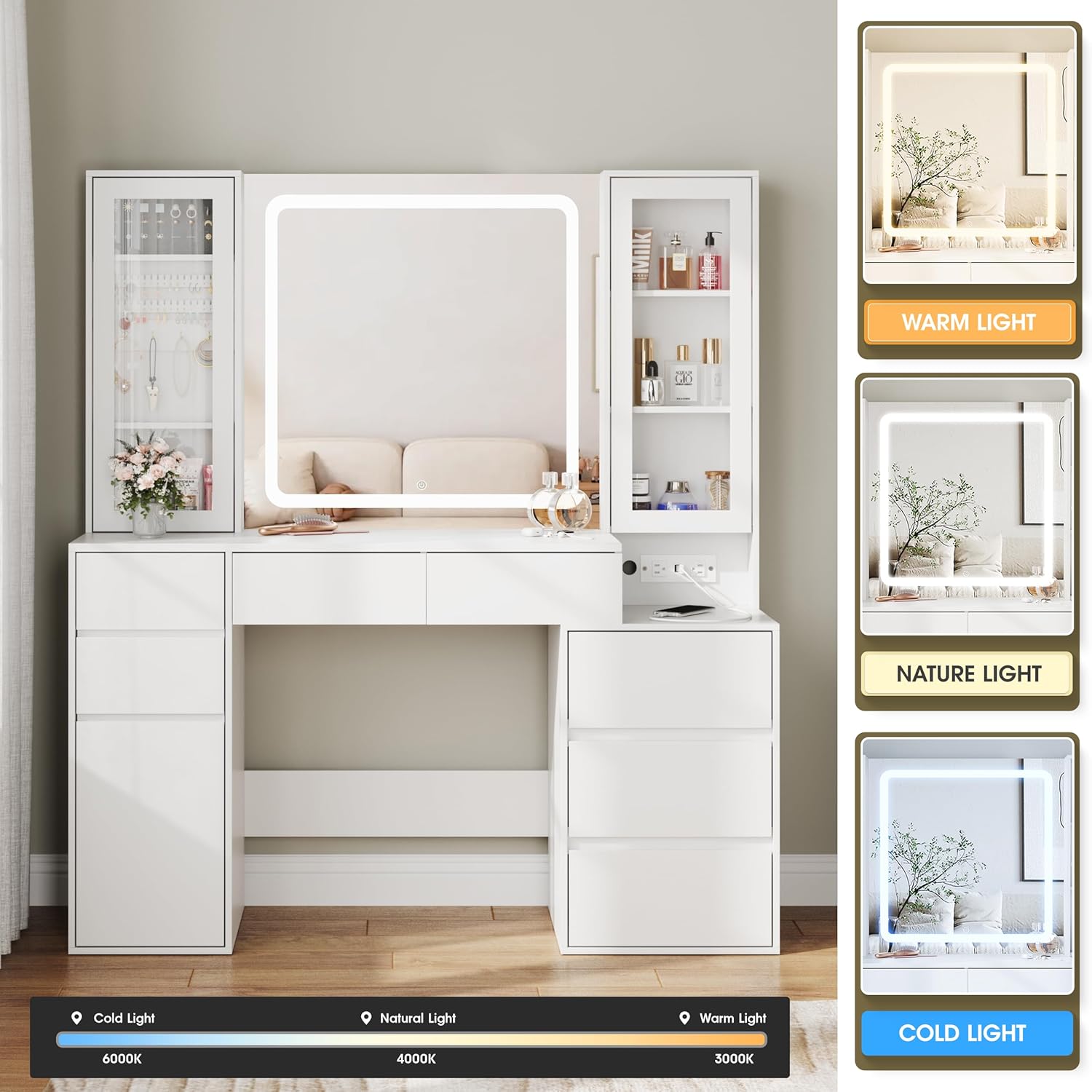 Makeup Vanity Desk with Mirror and Lights, White Makeup Vanity Table with 7 Drawers and 3 Cabinets, Makeup Desk with Charging Station, Dressing Table for Bedroom