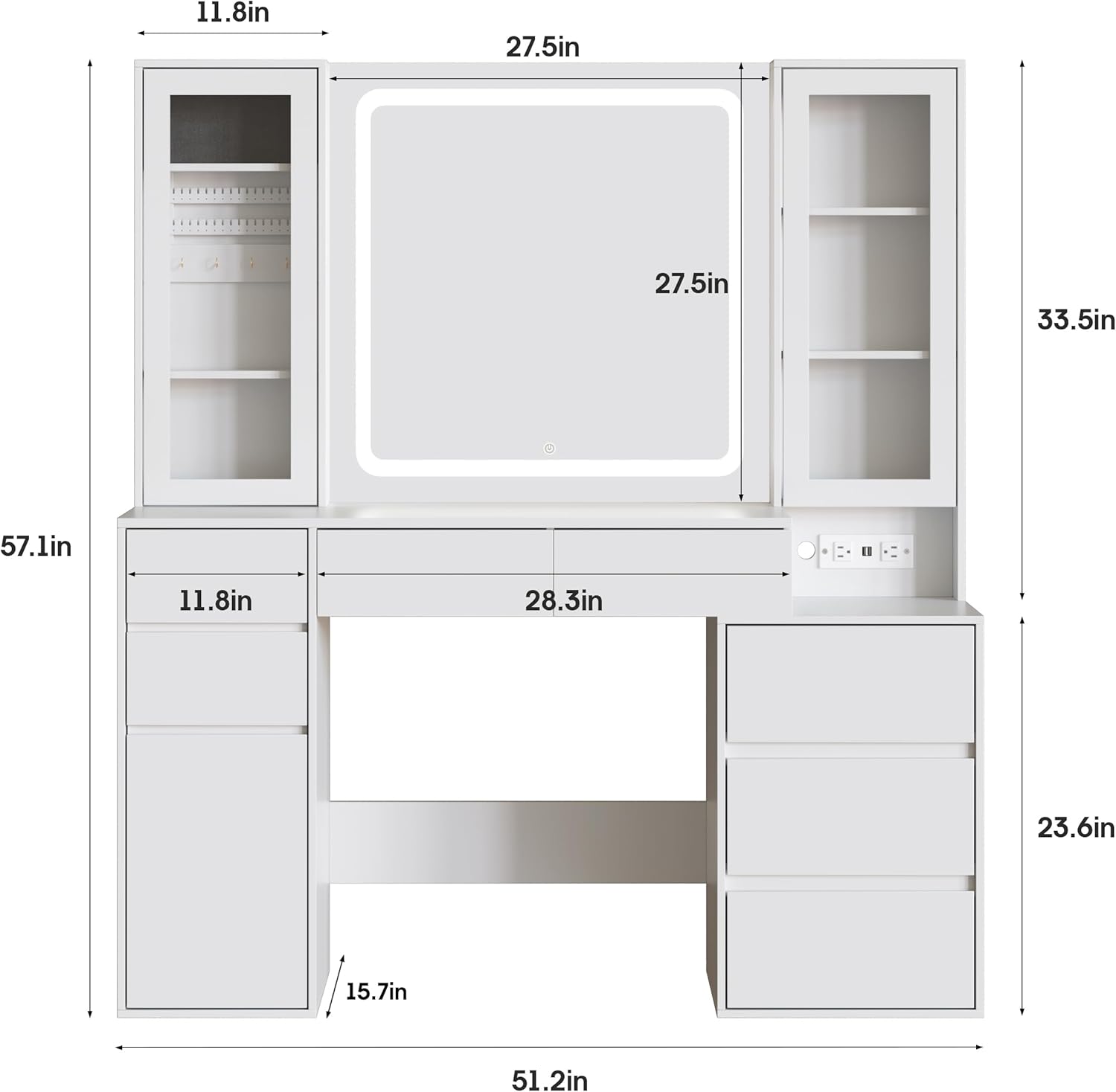 Color White Vanity Size 51.2″Lx 15.8″W x 57.1″H Quanity of Drawers 7 with charging staion Yes LED Mirror Mode Nature Light, Warm Light and Cold Light Assembly Required Yes