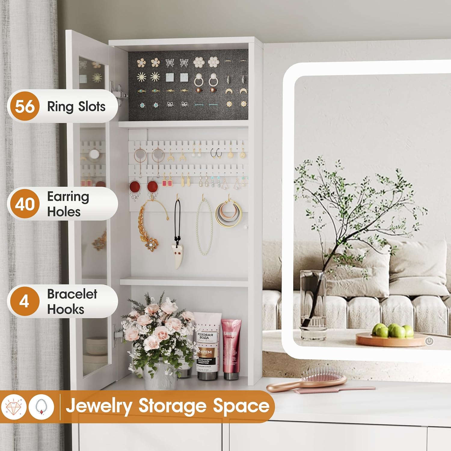 【Elegant & Unique Design for Jewelry Storage】 With 56 ring slots and 40 earring holes, 4 bracelet hooks, inside the glass cabinet of this gorgeous makeup vanity desk, there is plenty of storage space for your jewelry, ensuring that your jewelry is neatly arranged and easily accessible. Perfect size makeup vanity with lots drawers: 51.2(W)*15.7(D)*57.1(H)in.