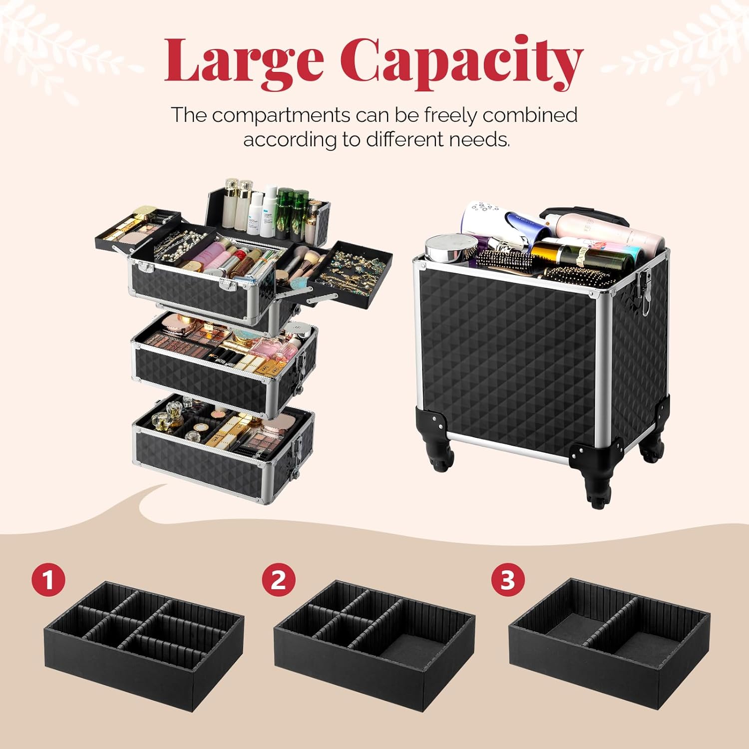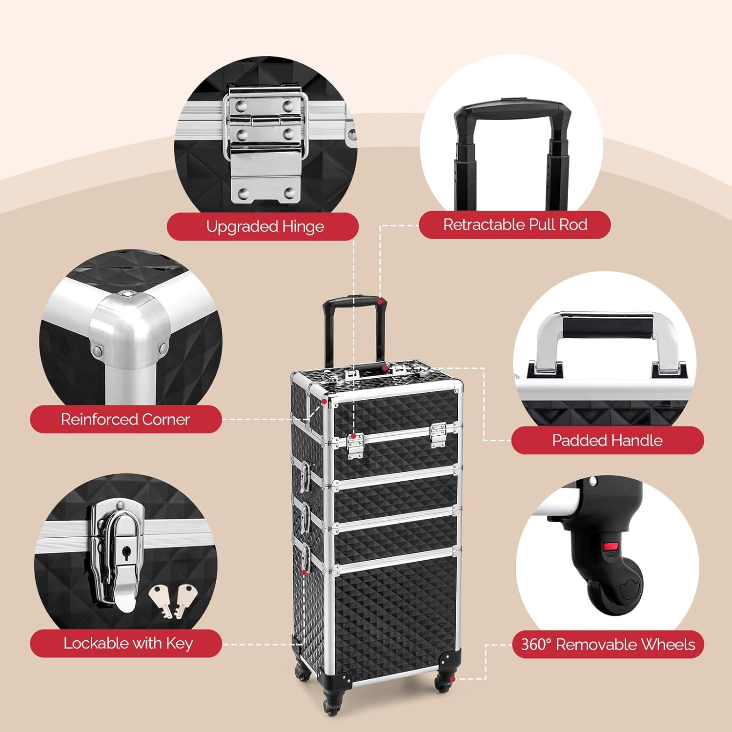 ★4 IN 1 DESIGNED:stylishly and lockable,Cosmetic trolley-upper top case and big bottom case,8 lockable keys to protect your privacy
