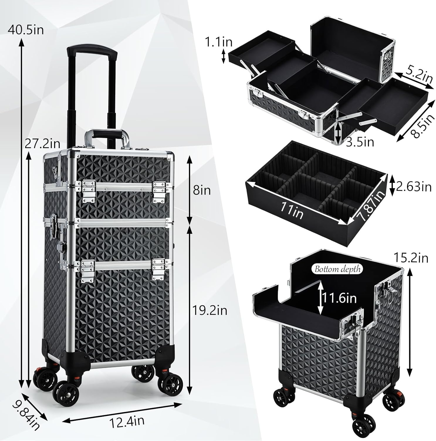Portable Rolling Train Case: This size rolling makeup case is 12.4 x 9.84 x 27.2 inches. Pull rod fully extended height can up to 40.5”, suitable and comfy height to use. Rolling makeup trolley with reinforced Grade-A Aluminum on all frames and a high-quality structure for extra durability and protection. It is also lockable with keys for privacy.