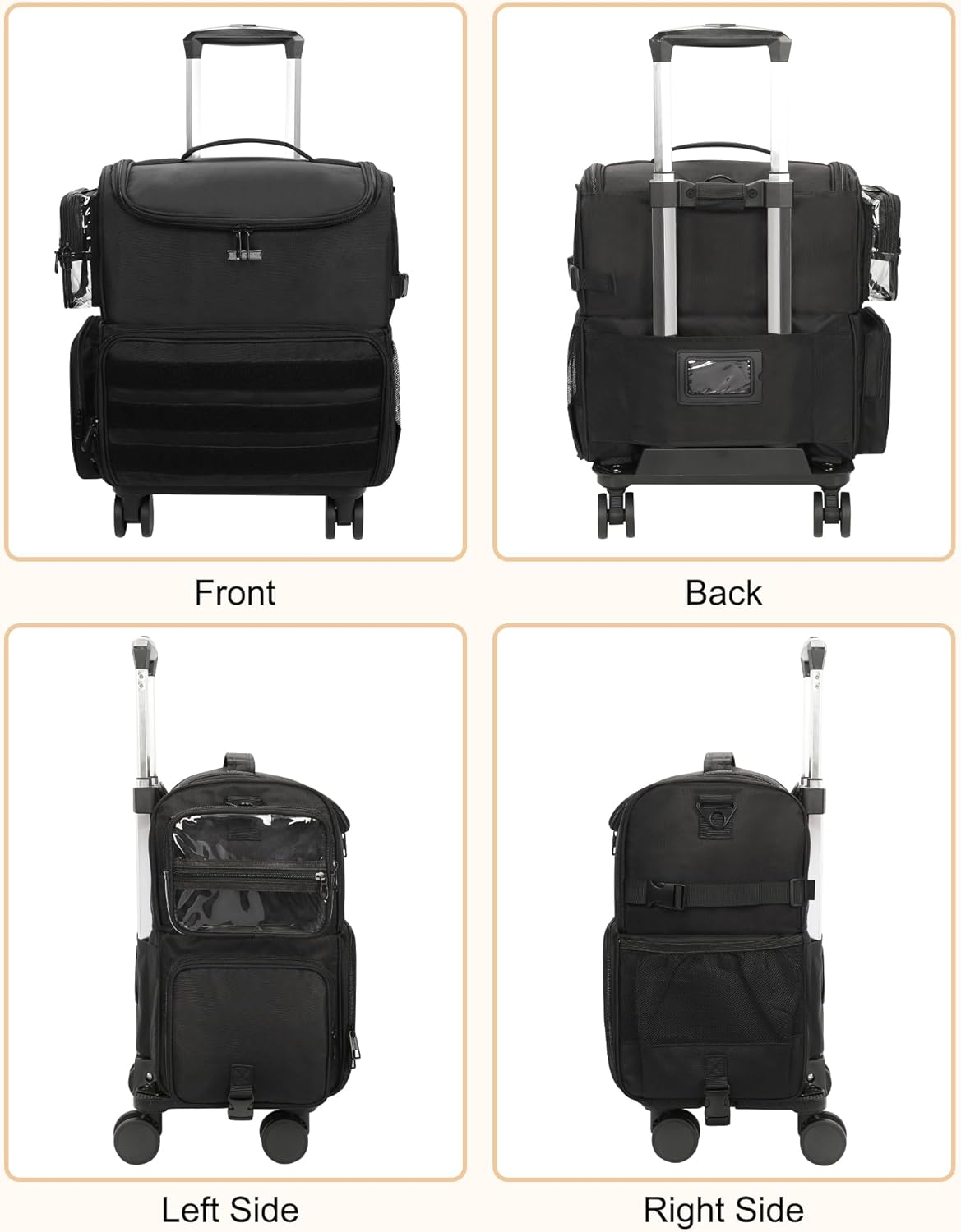 Portable Cosmetology Case On Wheels: Features 360° spinner wheels for smooth, quiet movement, with detachable/replaceable designs. A locking retractable handle, pull rod fully extended height can up to 37.5 inches. Includes vtop handles, and an adjustable shoulder strap—perfect for makeup artists on the go.