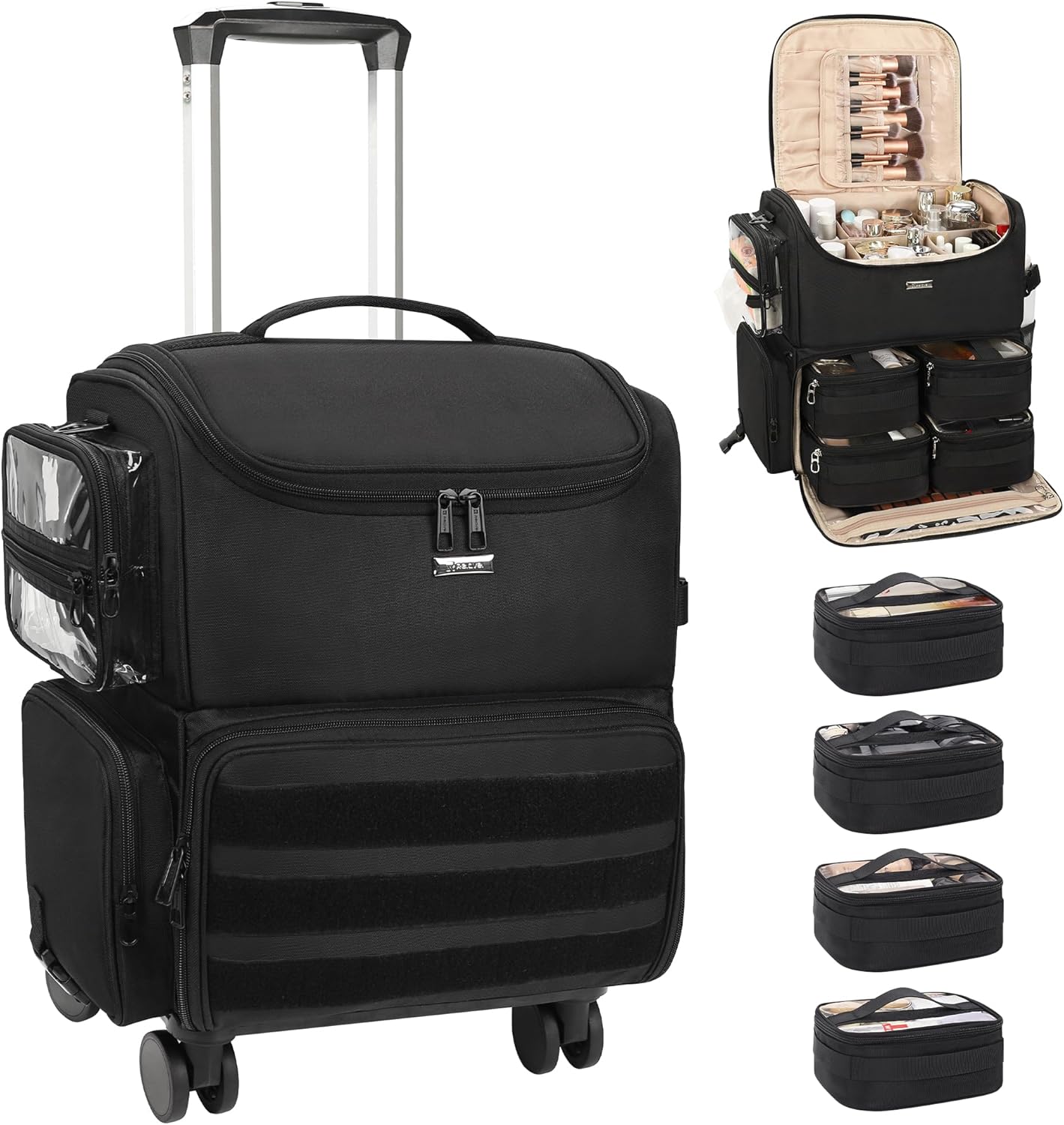 Relavel Rolling Makeup Train Case, Cosmetology Case on Wheels with 4 Clear Bags, Professional Makeup Artist Set Bags Cosmetic Storage Organizer with Adjustable Dividers, 360° Spinner Wheels, Black