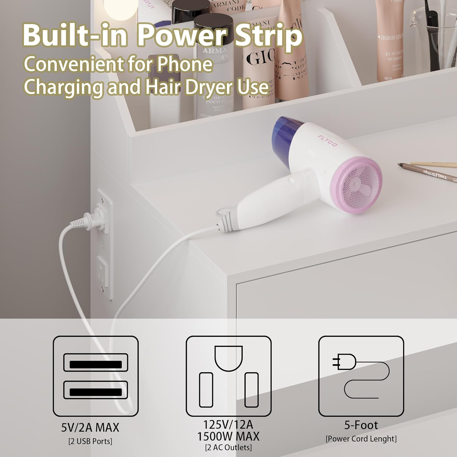 Built-in Power Outlets and USB Ports – Stay connected while getting ready with the integrated charging station, featuring two AC outlets and two USB ports. Conveniently use hair tools, charge your phone, or power beauty devices without leaving your seat
