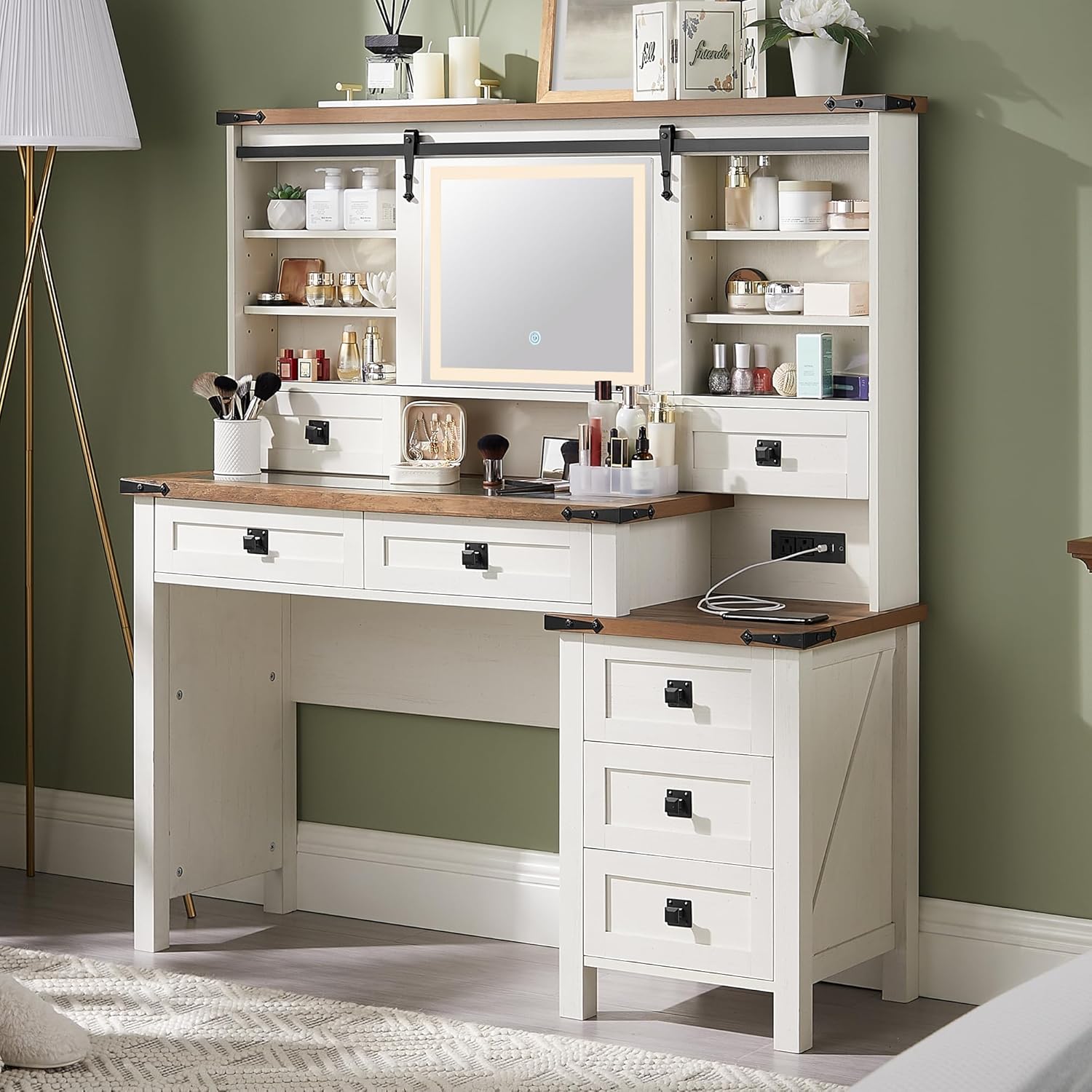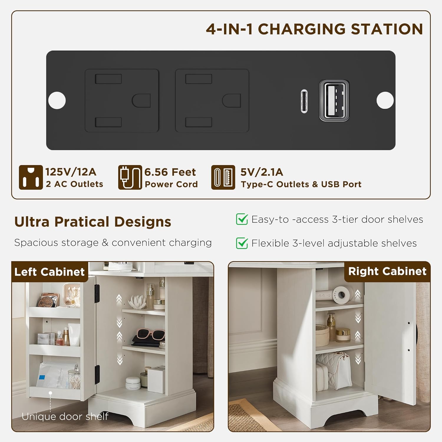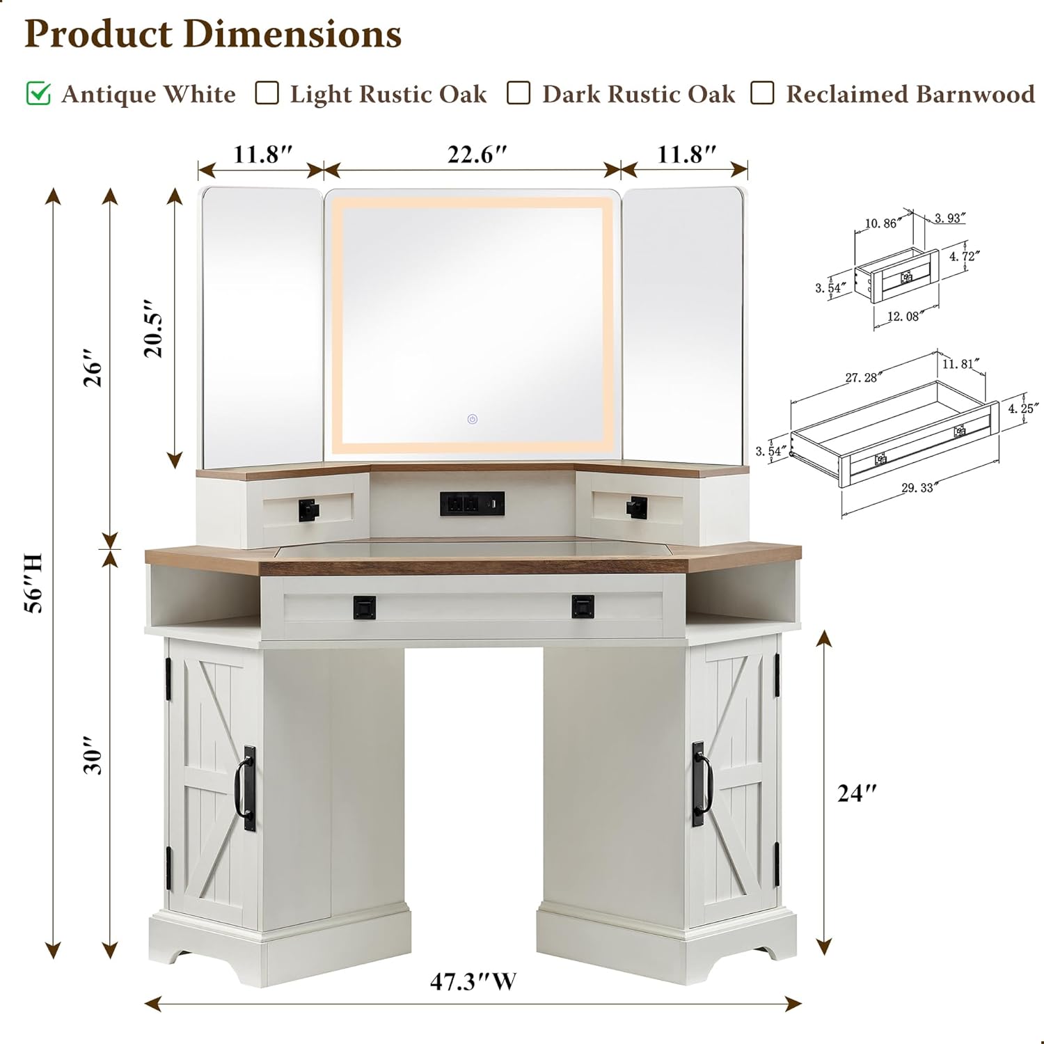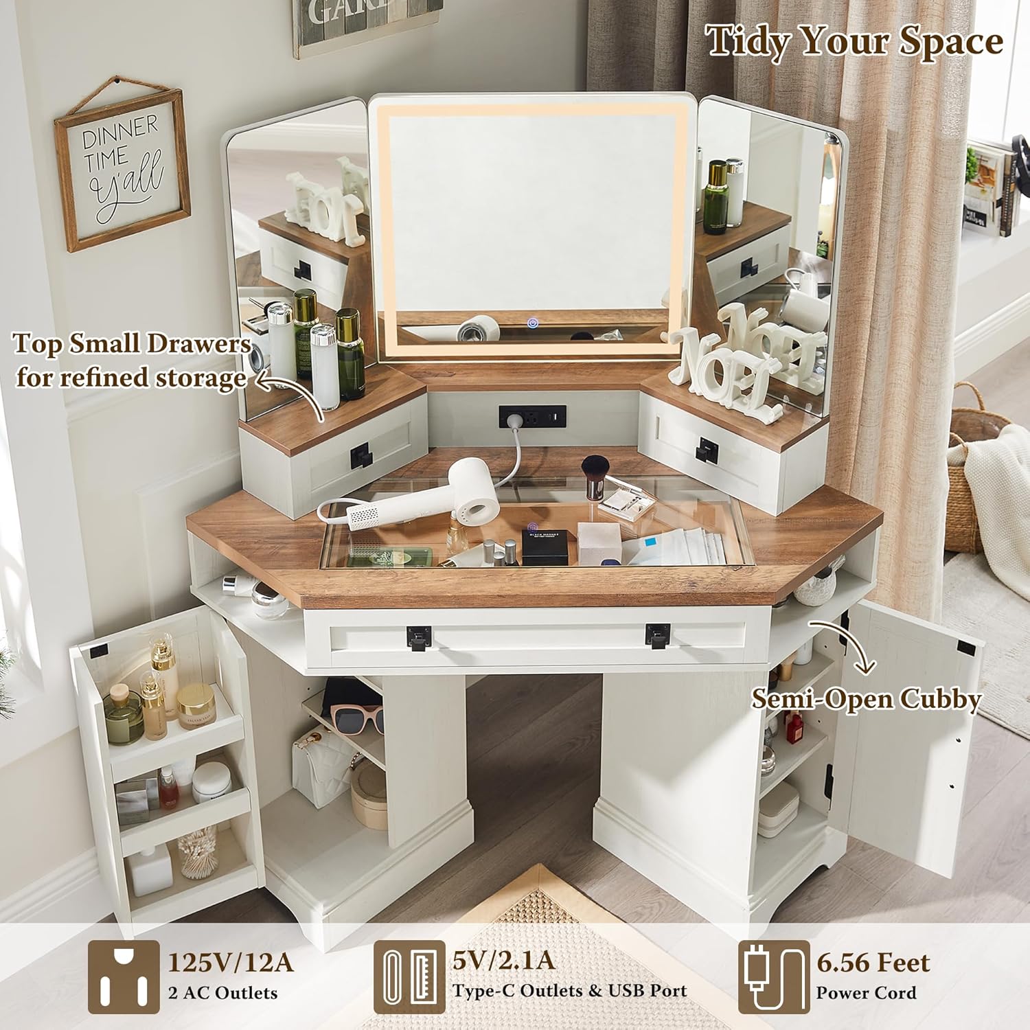 T4TREAM 48″ Corner Vanity Desk with 3 Way Mirror and Lights, Farmhouse Makeup Vanity with Charging Station & Glass Top, Dressing Table with 3 Drawers, 2 Cabinets & Adjustable Shelves (Antique White)