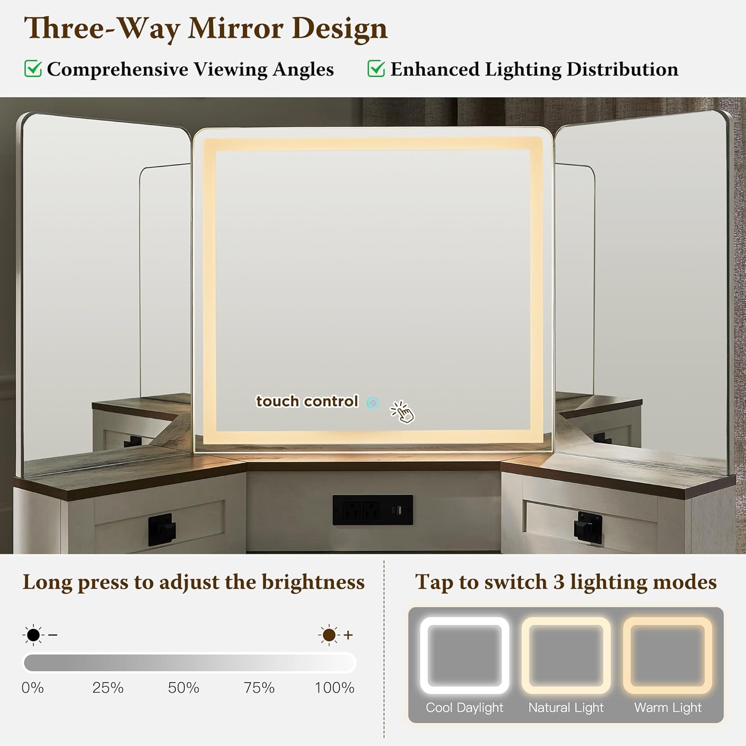 Smart Illumination & All-Angle Visibility: Achieve flawless makeup & hairstyling with the 3-way mirror system (23″ center + two 12″ side mirrors) for 360° visibility. The touch-controlled LED lighting offers adjustable brightness & color temperature (warm/cool/natural) to match any lighting condition. Plus, 2 AC outlets + USB/Type-C ports keep your devices charged and ready.