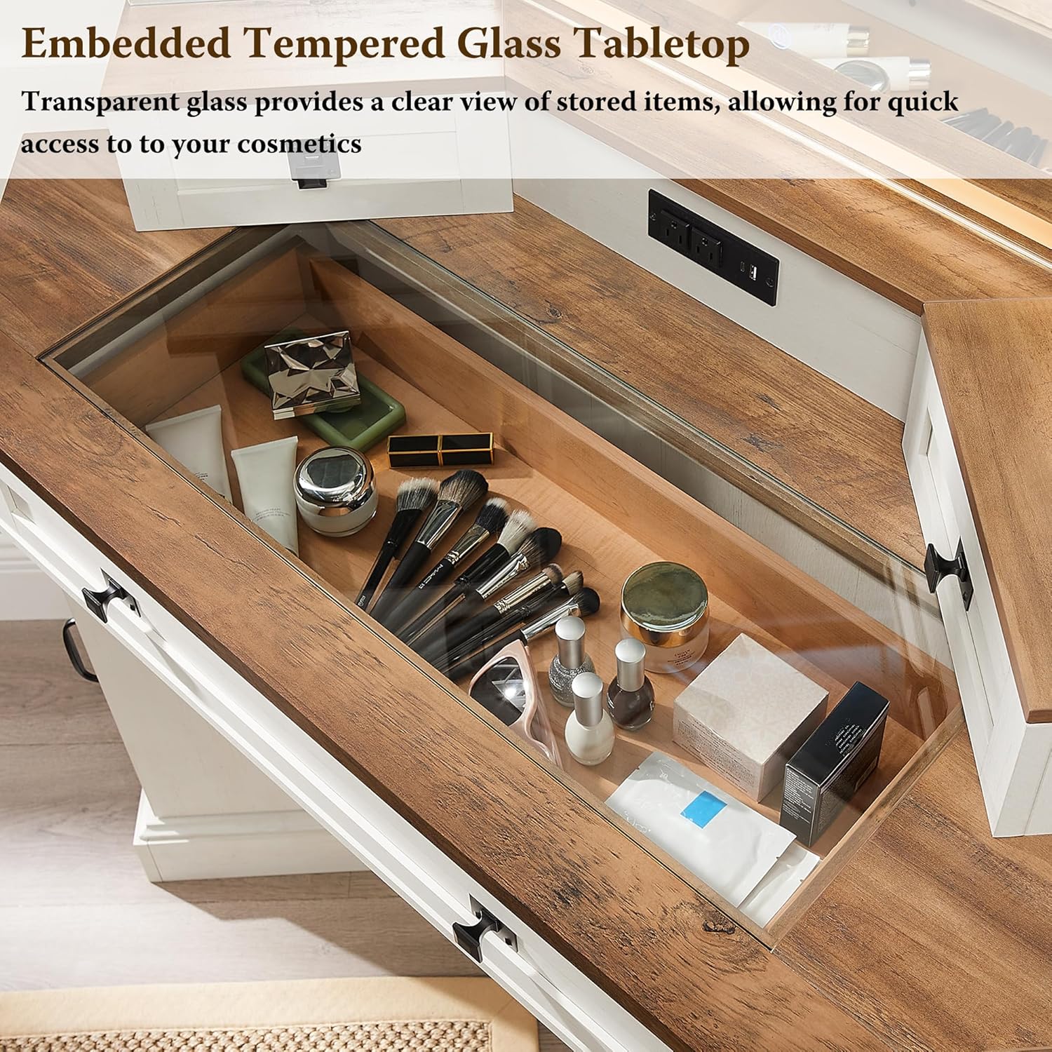 Ultra-Spacious & Organized Storage: No more clutter! The tempered glass top vanity provides a scratch-resistant, heatproof surface while showcasing your beauty essentials. Inside, enjoy 2 top drawers, a 28″ wide middle drawer, 2 side cubbies, and dual cabinets with adjustable shelves—all designed to keep everything tidy yet accessible.