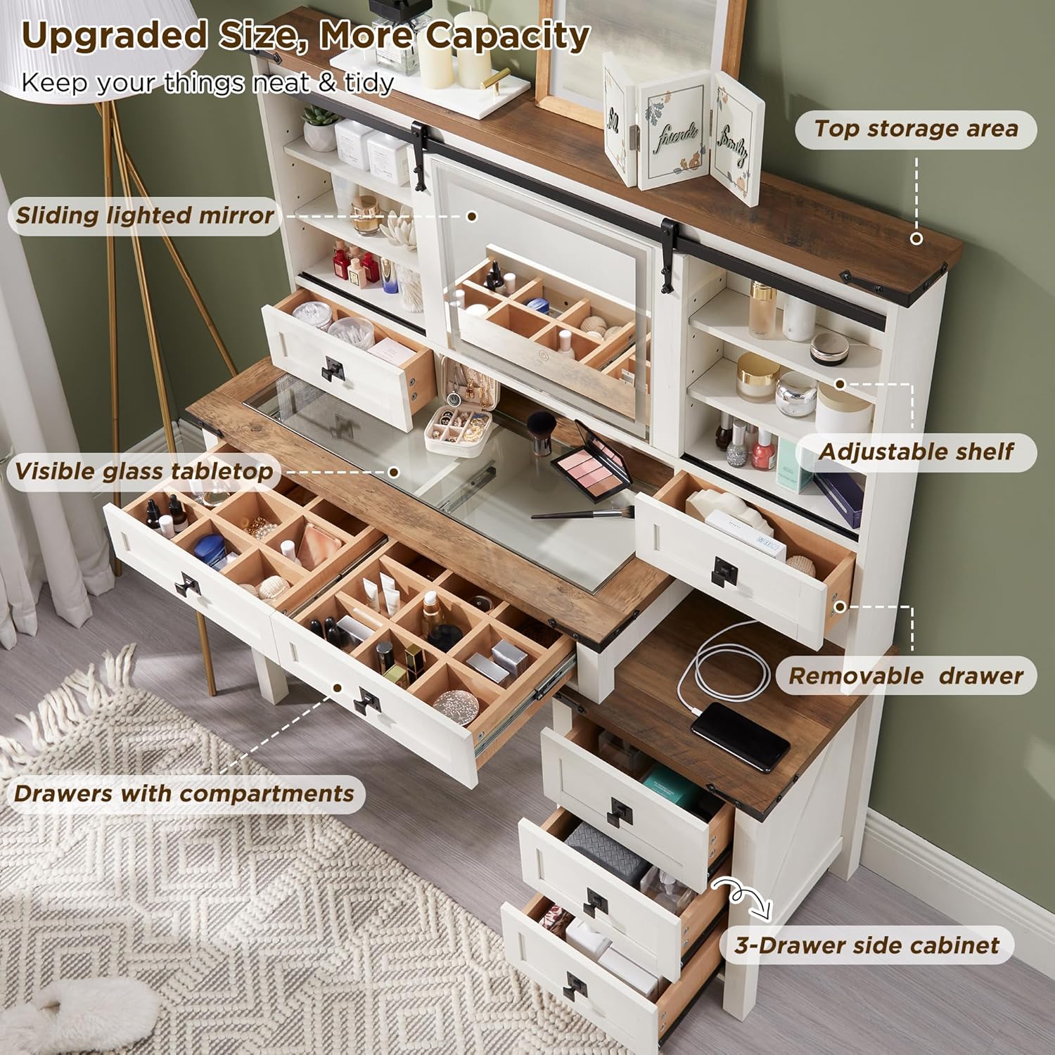 T4TREAM 48” Farmhouse Makeup Vanity Desk with Sliding HD Mirror and Lights, Big Modern Lighted Vanity Table with 7 Drawers & Shelves, Rustic Large Dressing Table, Antique White