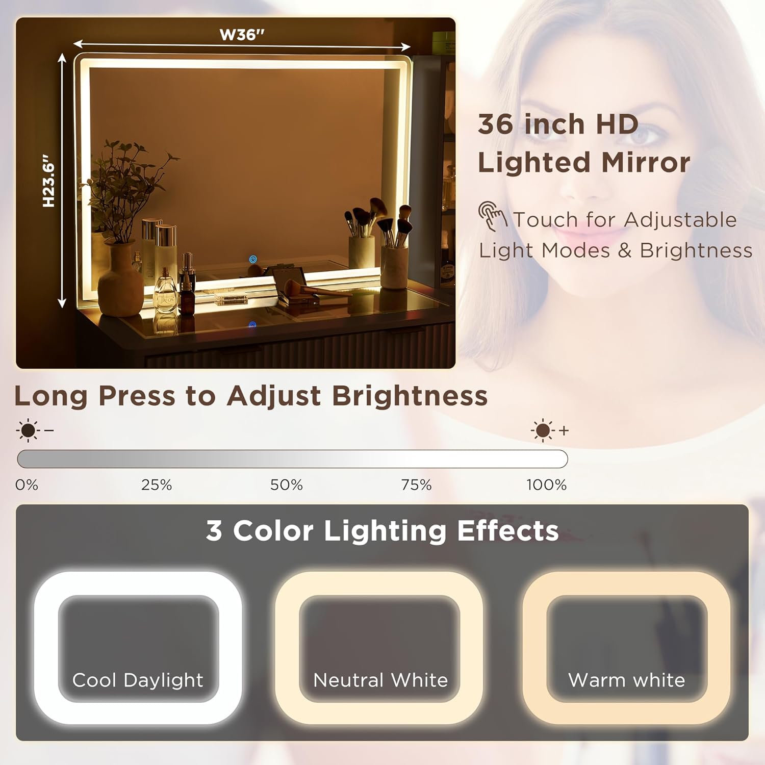36 Inch Large Size Mirror & Adjustable light: T4TREAM 48″ fluted vanity desk with mirror and lights offers a super large 36“ size mirror, which can ensure a true and accurate reflection, eliminating distortions that could potentially affect makeup precision. High-quality LEDs around the mirror can be switched to natural, warm, and cool light. Long-pressing the button allows you to adjust the brightness of the lights