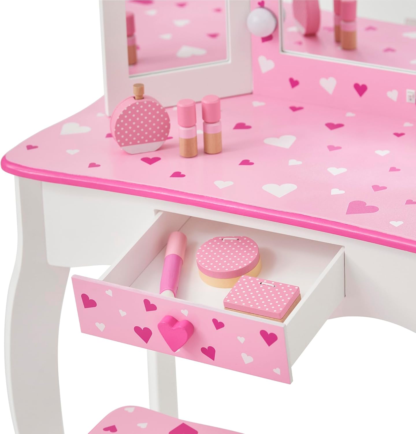 Teamson Kids Vanity Set for Girls with LED Lights, Tri-Fold Mirror, Stool & Drawer, Pretend Makeup Table for Toddlers, Heart Design, Wooden White Pink Princess Play Furniture, Ages 3+