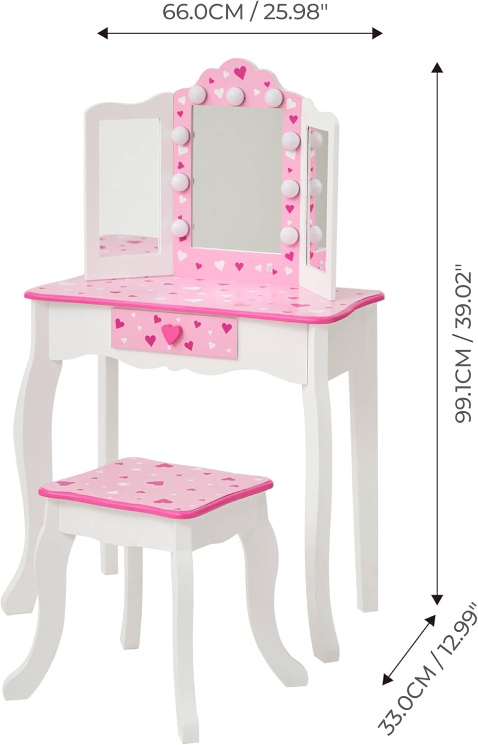 Create a magical space where dreams come true with the Teamson Kids Gisele Heart Vanity Set. Designed for toddlers and preschoolers ages 3 and up, this elegant white and pink makeup table features a tri-fold mirror with 9 built-in LED lights, a child-sized stool, and a center drawer to store all your little one’s pretend beauty essentials. Made from durable engineered wood and finished in lead- and phthalate-free paint, this vanity includes charming heart-shaped patterns and French cabriole-style legs for a princess-worthy look. Whether your child is playing salon, dressing up their dolls, or simply admiring their smile, this vanity set encourages confidence, imagination, and independence. Compact enough for bedrooms or playrooms and sturdy enough for everyday use, it’s the perfect gift for birthdays, holidays, or just because. Plus, with easy assembly and certified safety standards, parents can feel confident while kids play in style.