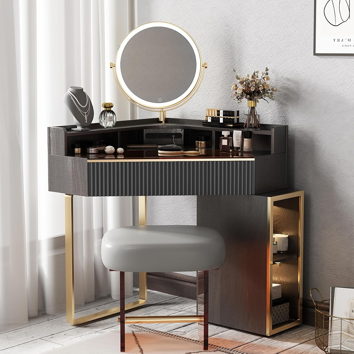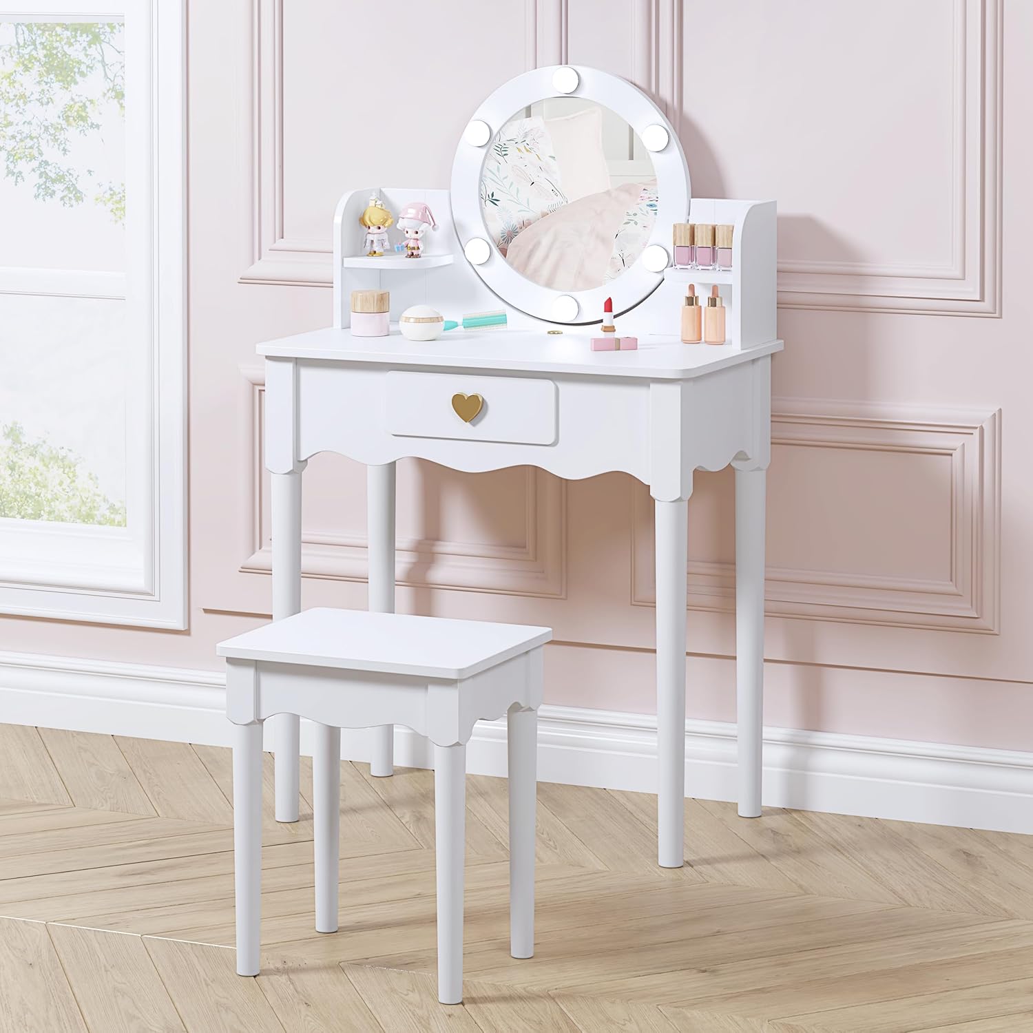 【MULTIPLE STORAGE SPACE】: Our little girls vanity set with stool is equipped with spacious tabletop, 2-layer open shelf on the both side, 1 drawer for your little one to sort beauty, cosmetics, Nail polish or other small belongings. this kids vanity with lights not only keep everything organized and easy to reach, make your kids bedroom more tidy and clean. but also helps to cultivate the habit of organizing things.