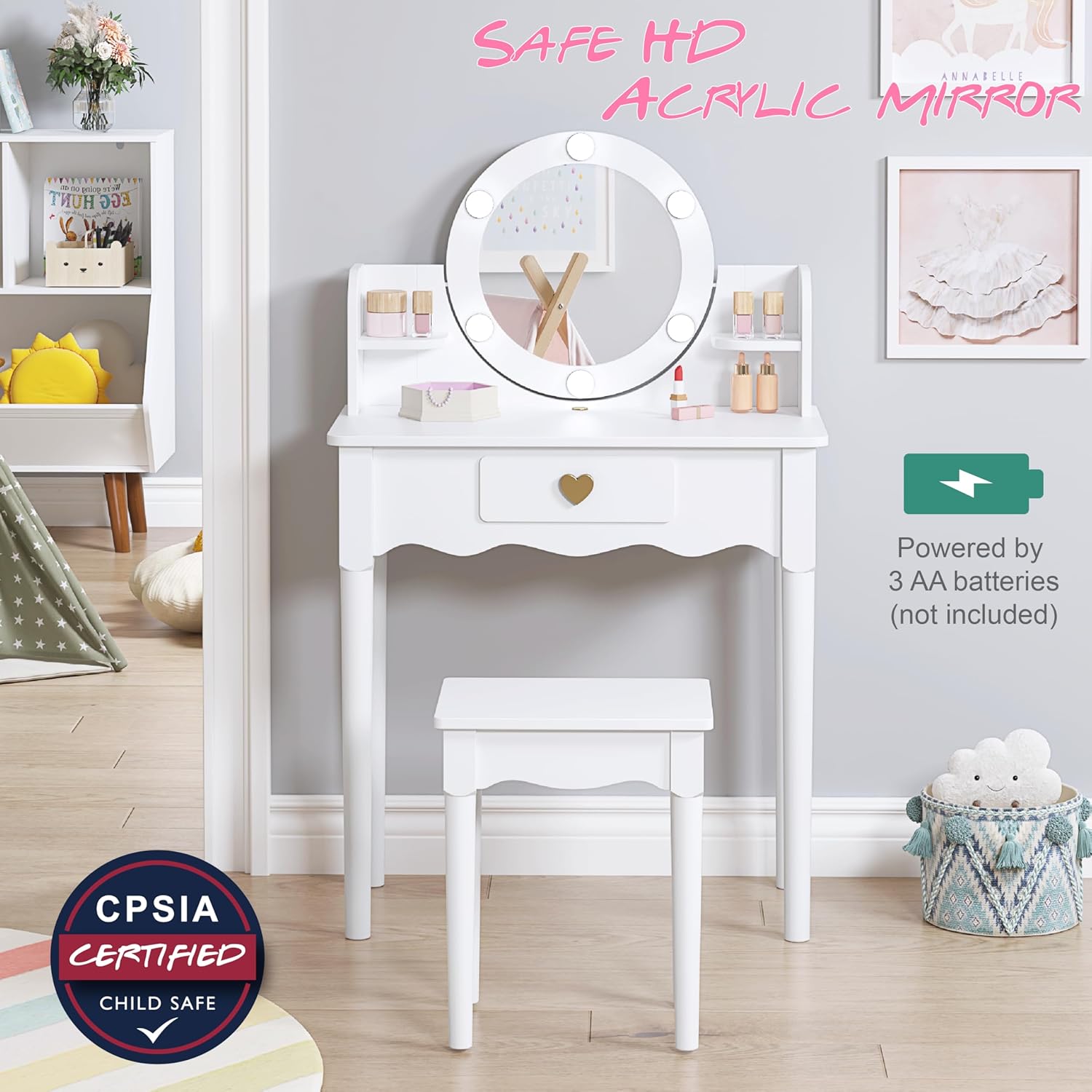 【QUALITY AND SAFETY MATERIAL】: Our little girl vanity made of quality manufactured wood, sturdy and durable, white painted makeup vanity for kids with smooth and wear-resistant surface,certified by ASTM, CPSIA and CPC, It is free from harmful toxins and meet safety standards to ensure the well-being of your children.