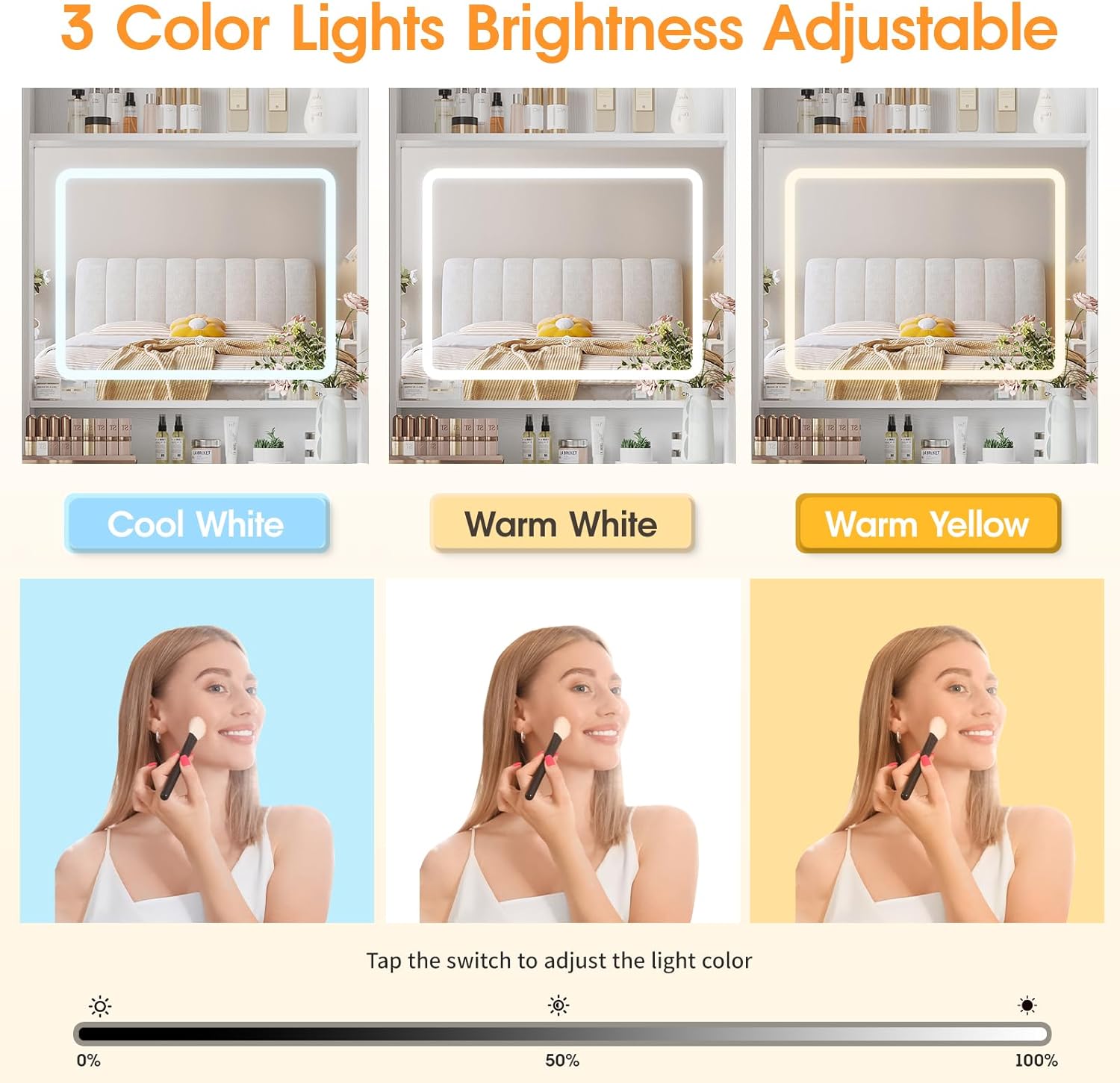 【3 Models Light & Adjustable Brightness】The glamorous vanity mirror comes with bright but not blinding LED lights in 4 color modes, warm yellow, warm white and cold white, and features a new high sensitivity smart sensor switch to control the LED lights, adjusting the lightness or darkness according to the desired level of brightness
