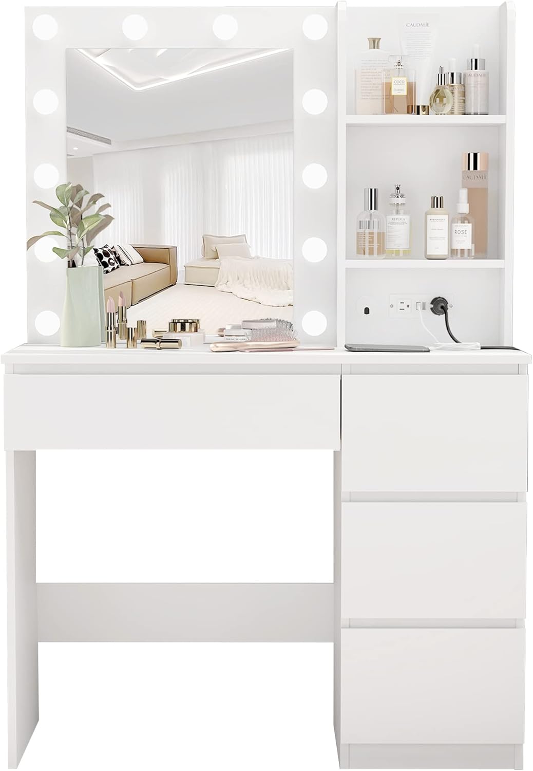 👑【Built-in Charging Station】Upgrade design! This vanity table add 2 standard plug sockets and 2 USB ports, more convenient for curling iron, beauty device, hair dryer and phone charging. Nice make up vanity for dressing room, salon or live broadcast.