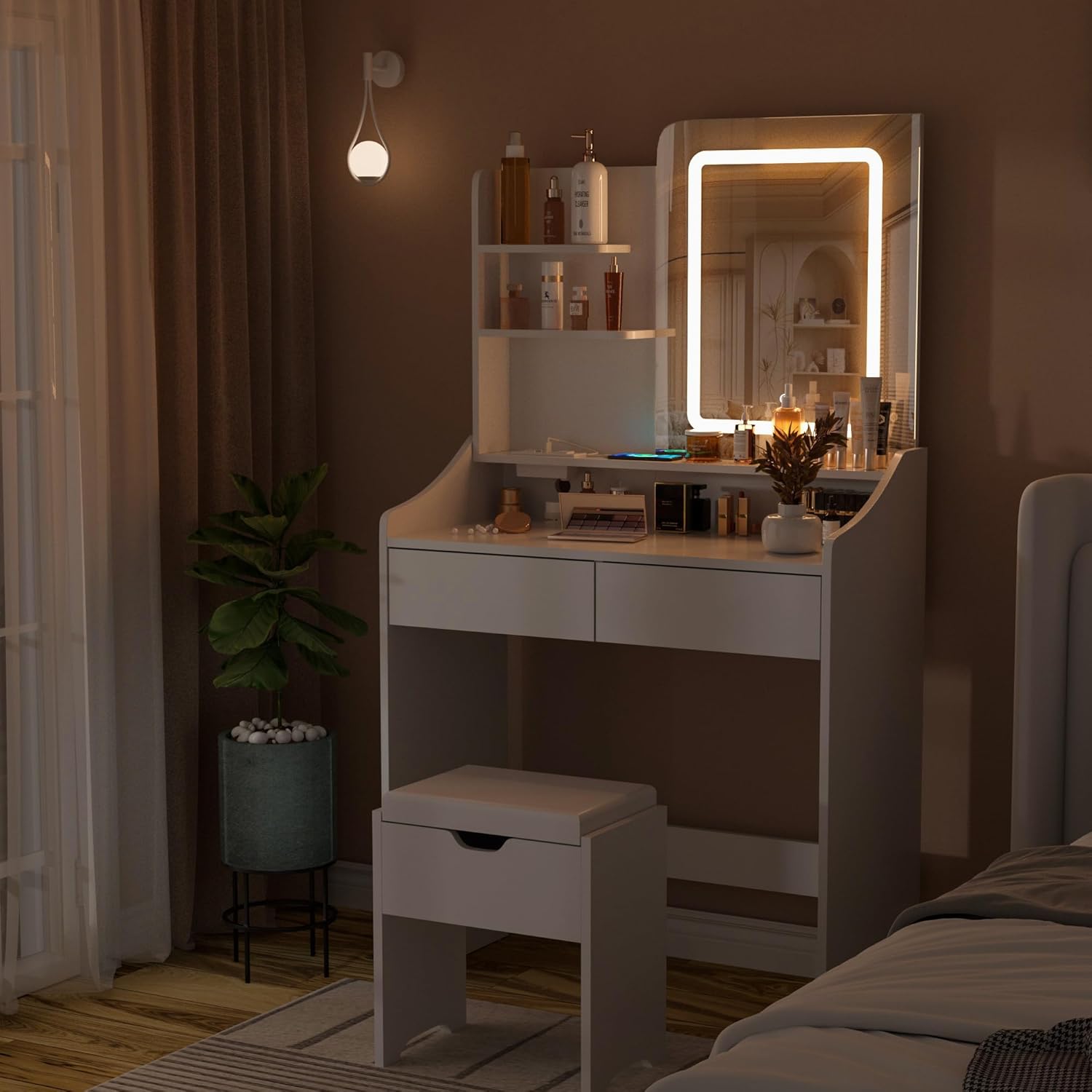Vanity with Storage: Make your room look very neat and elegant. This vanity desk with mirror and lights has a wide table top and 4 open shelves, 2 drawers, 1 large under-desk shelf. You are able to easily find your cosmetics, jewelry and other beauty supplies. The hidden space inside the stool can store your personal items