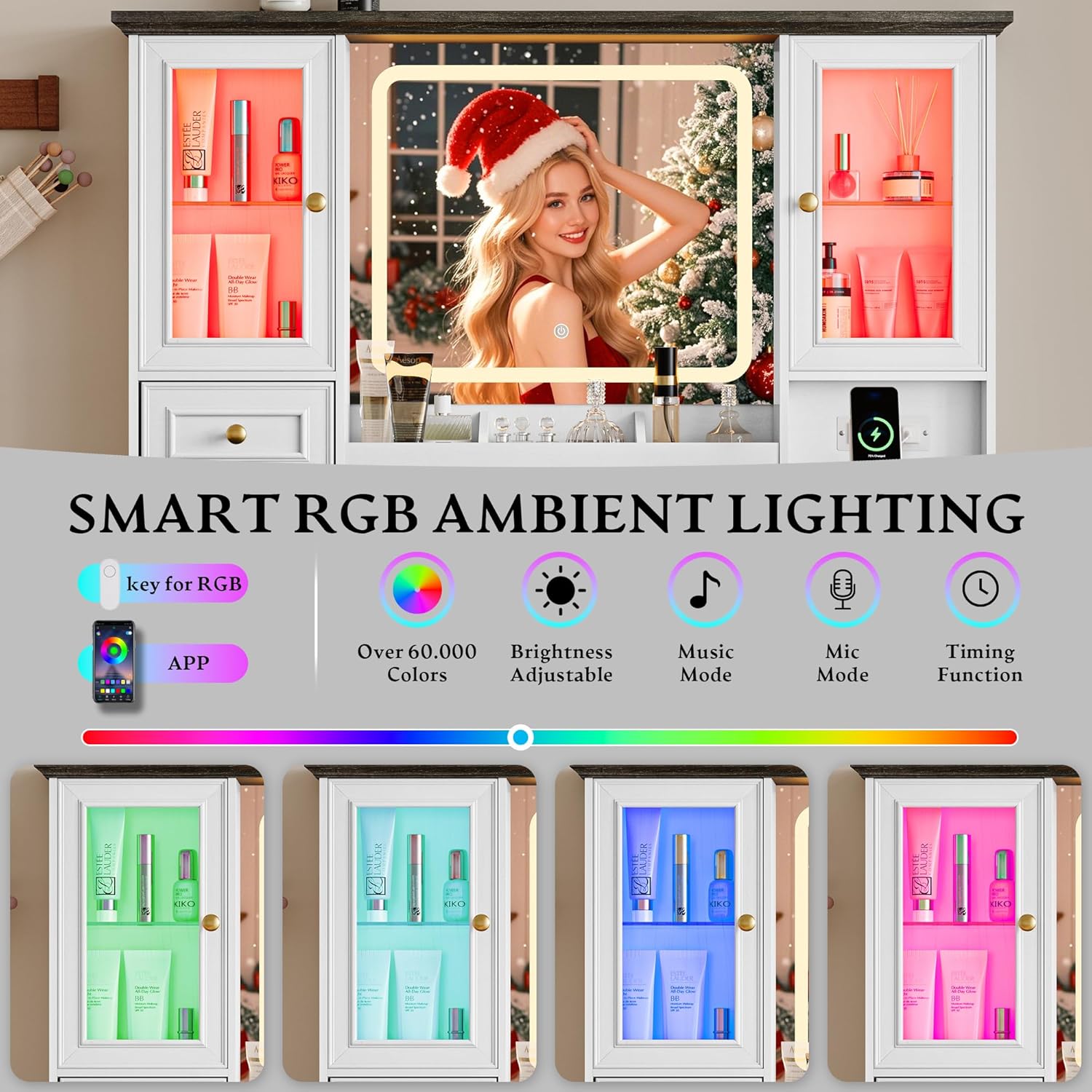 【Glass Cabinets with RGB Ambient Light】The vanity desk with mirror and lights equipped with an RGB ambient light inside the glass cabinet, which can be controlled by mobile app or button. There are more than 60,000 static light colors, multiple dynamic light modes, music mode, microphone mode and timing function. The music mode allows the LED lights to flash to the rhythm of music. Bring you a great visual feast