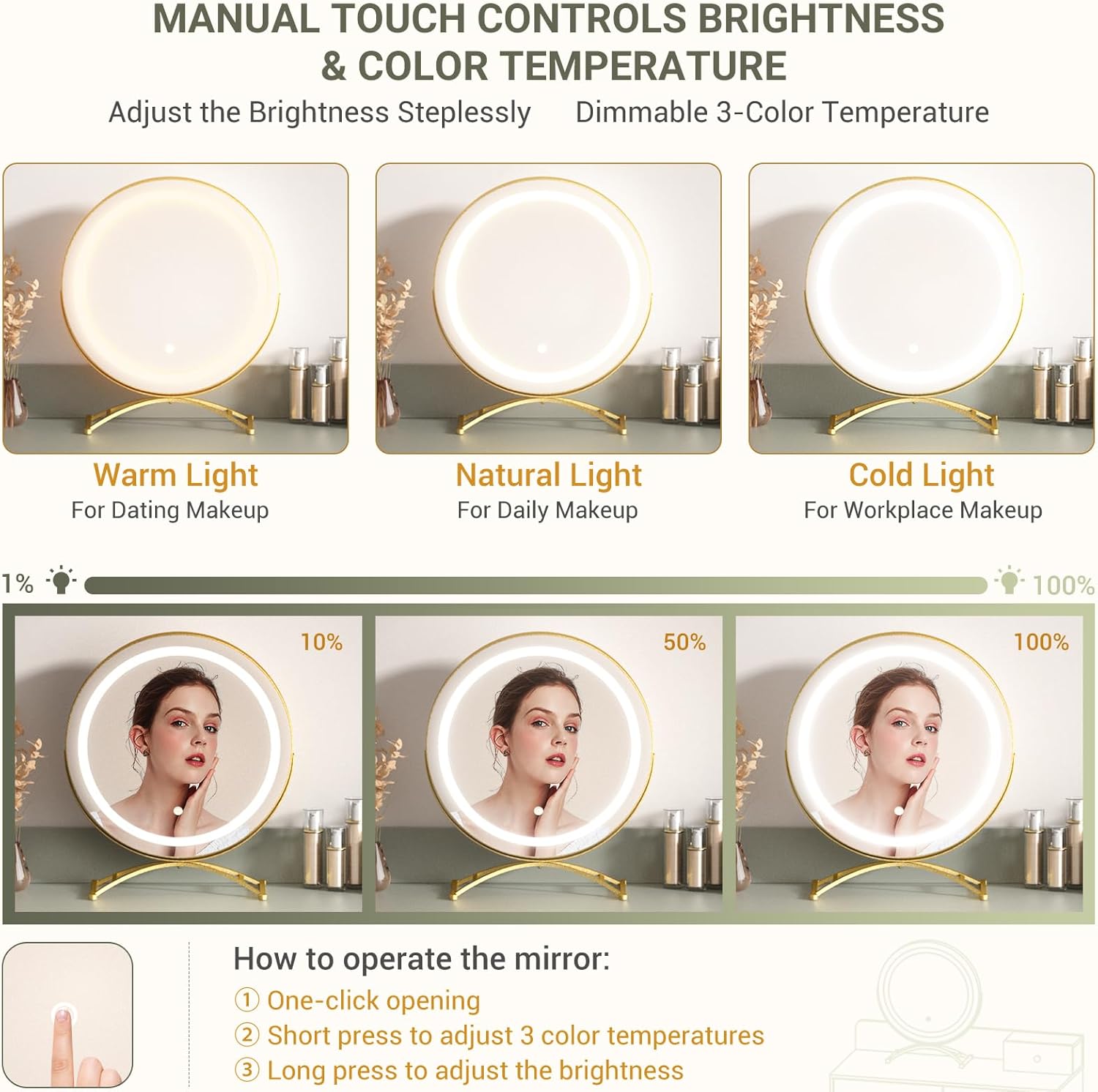 Vanity Desk with Mirror & 3 Colors Lights: Our vanity makeup desk provide a round movable mirror with 3 different color settings: warm yellow, natural white and cold white light, soft and not dazzling light source, allowing you to make-up for a long time without hurting your eyes. You can click the button easy to change the color or adjust the brightness steplessly according to different scenes and different makeup. Bring yourself a joyful dressing experience with this makeup vanity.