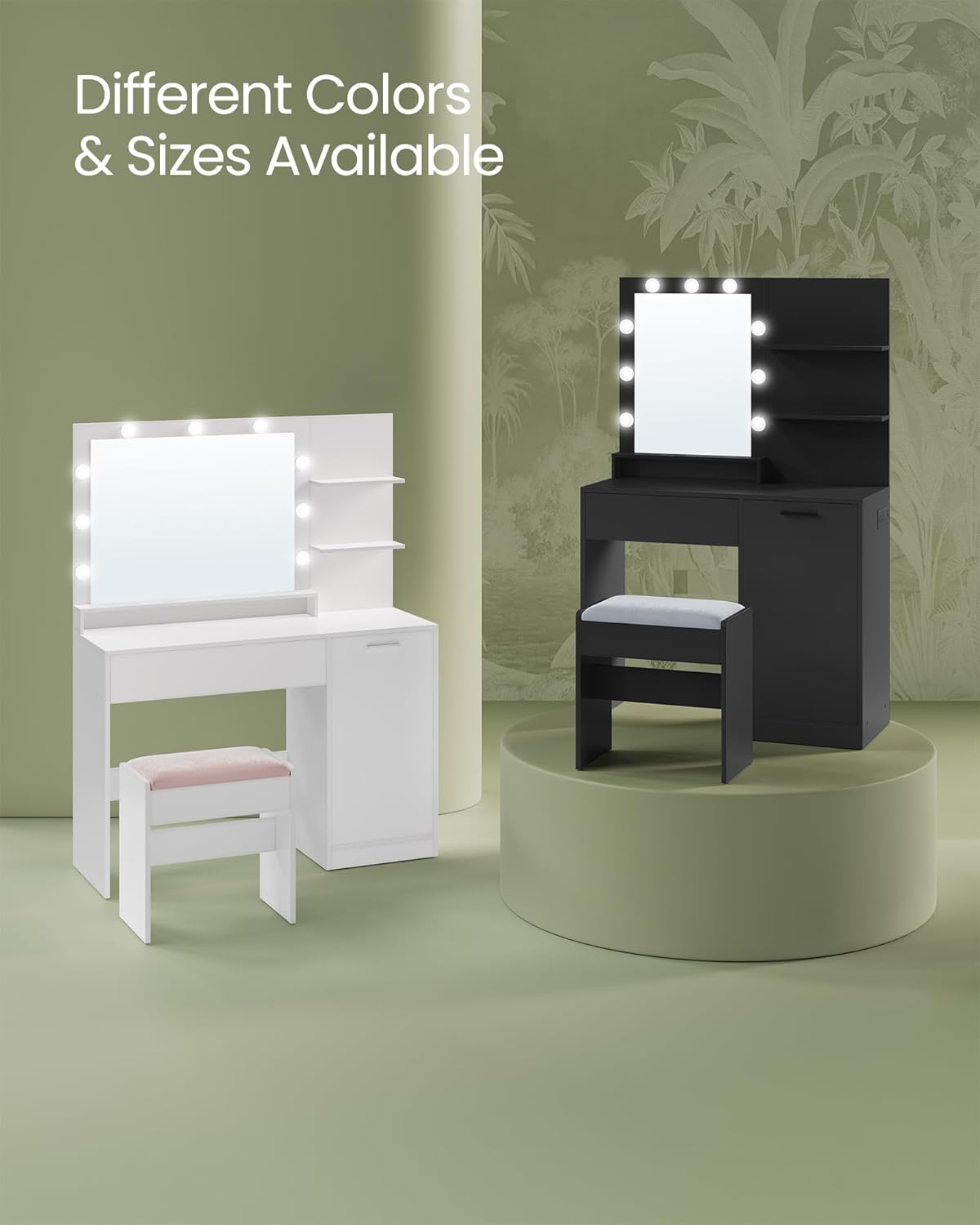 VASAGLE Vanity Desk with Mirror and Lights, 35.4-Inch Wide Makeup Vanity with Upholstered Vanity Stool, Power Outlets, Dimmable LED Lights, Storage Drawer, for Bedroom, Ink Black URDT128B01
