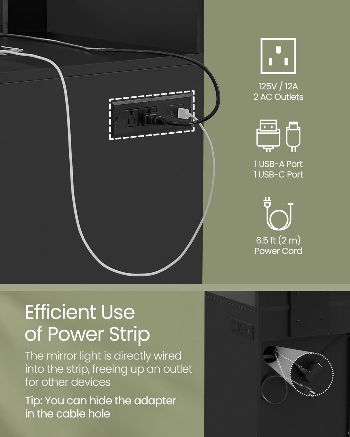 【CONVENIENT POWER HUB】The built-in power strip with 2 outlets, 1 USB-A, and 1 USB-C port conveniently powers your hair tools and charges your phone. The mirror’s light is cleverly wired into the strip, freeing up an outlet for other appliances