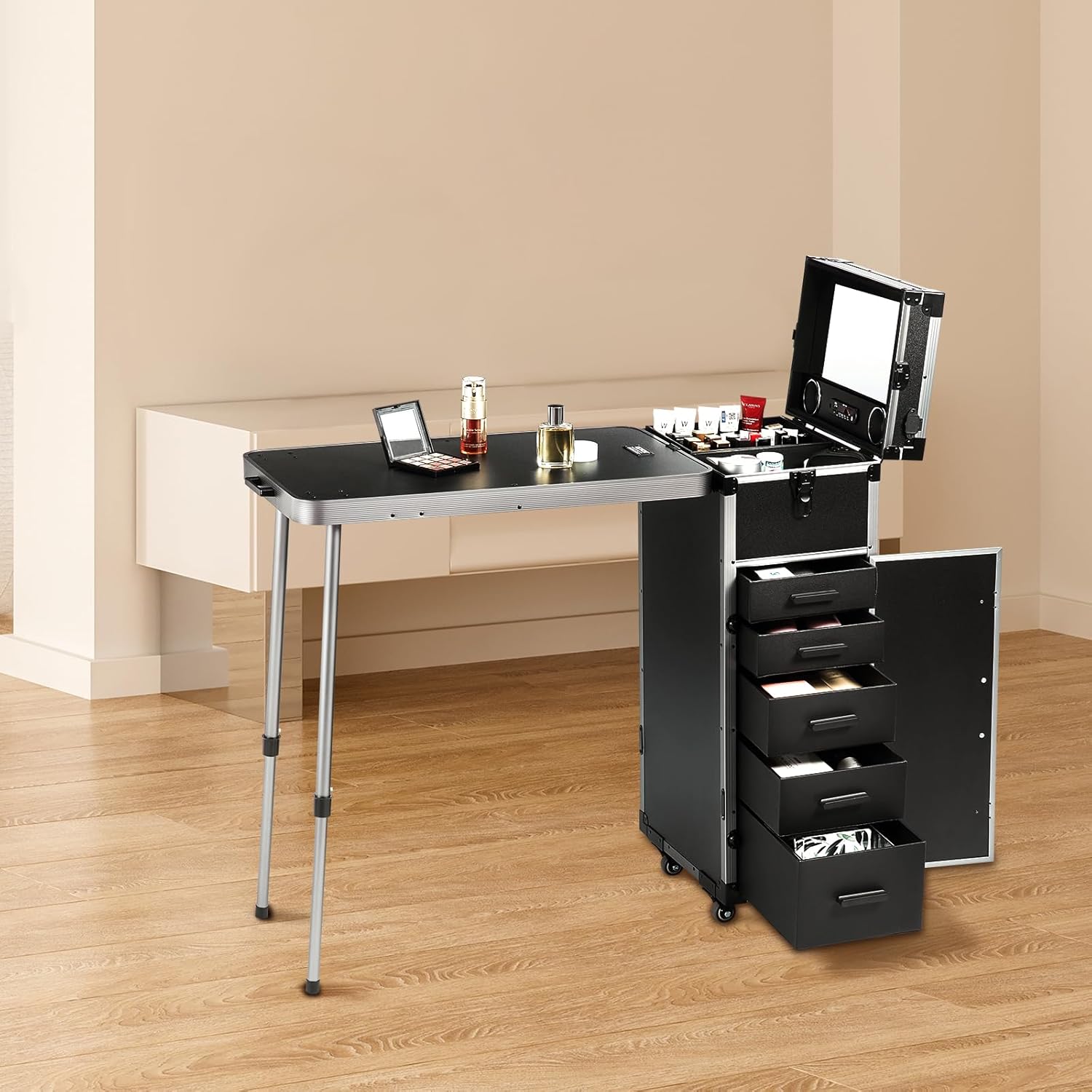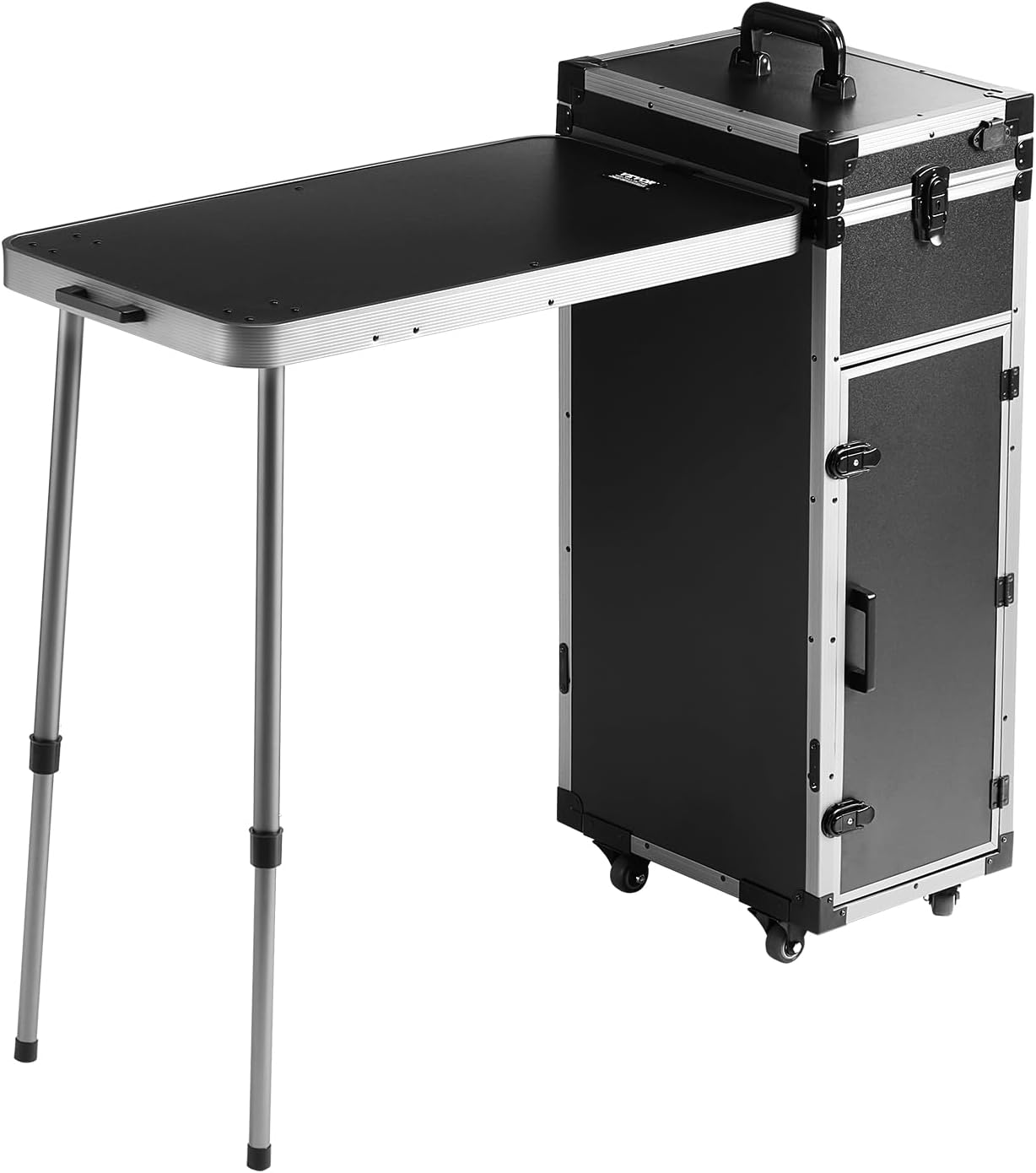 The makeup case has a robust and wear-resistant exterior shell made from high-hardness plastic. The metal frame and corner fixtures provide secure fastening, ensuring they won’t easily come loose. The workbench top features a support design, offering stability during use.