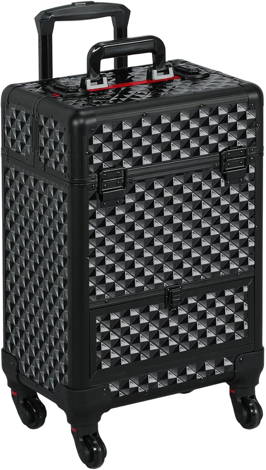 Yaheetech Rolling Makeup Train Case Aluminum Cosmetic Case with Wheels Barber Case Salon Lockable Travel Trolley with Sliding Drawers Removable Divider, Black/Red