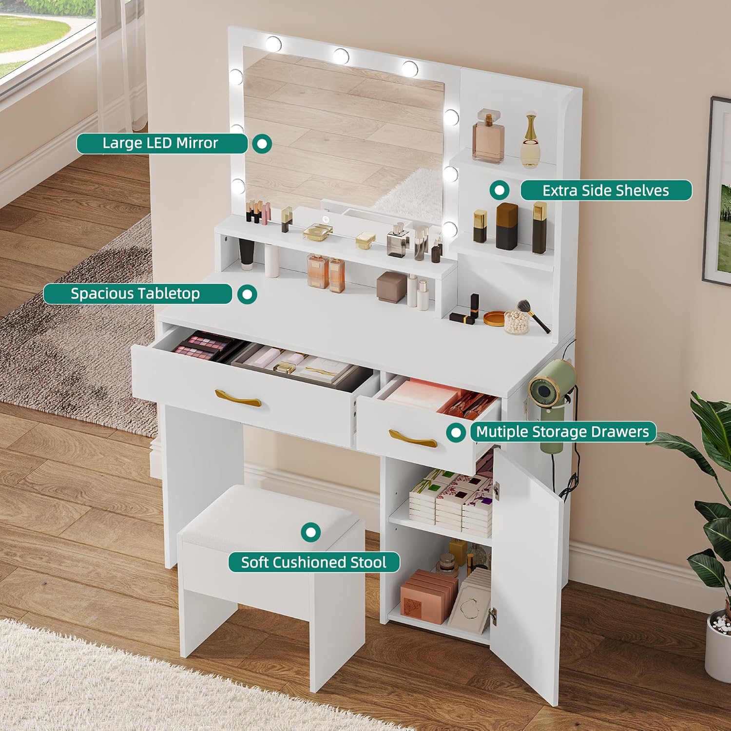 Durable and Elegant: Built from sturdy P2 particle board and MDF, this vanity set combines long-lasting strength with a sleek white finish and smart storage solutions, fitting beautifully in any bedroom, dorm, apartment, guest room, or dressing space