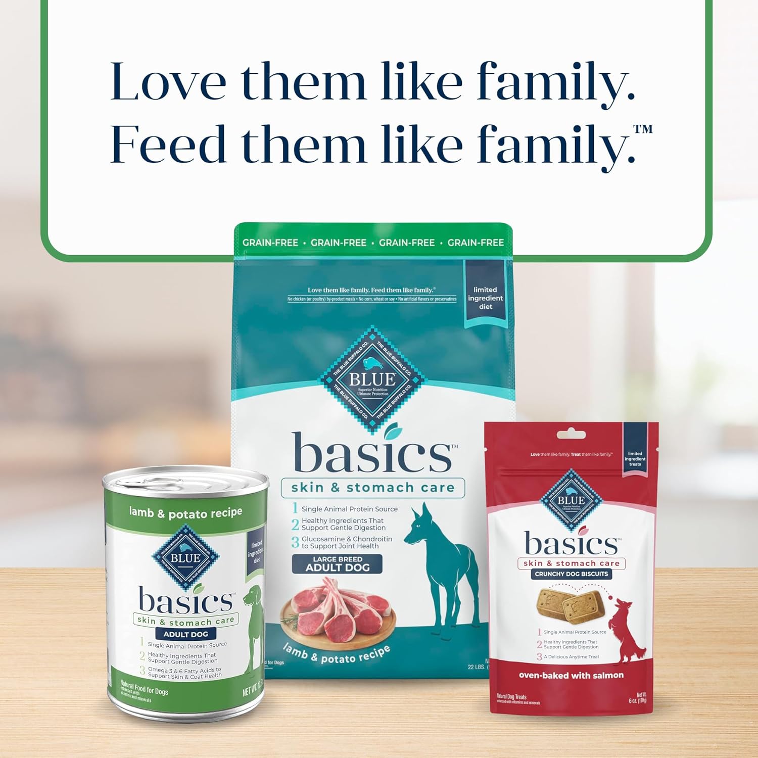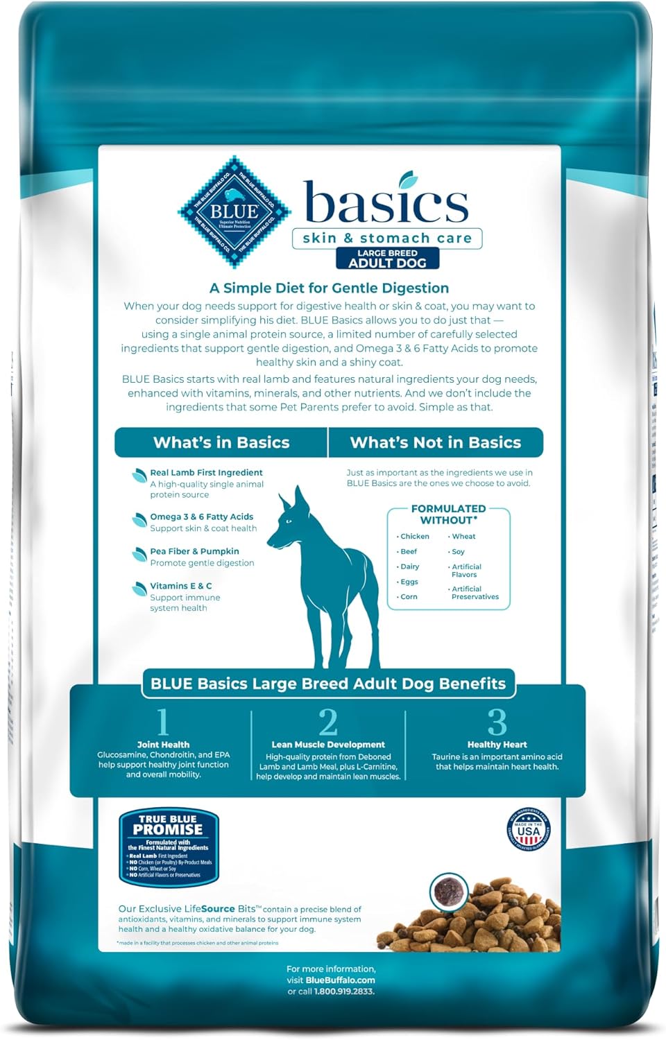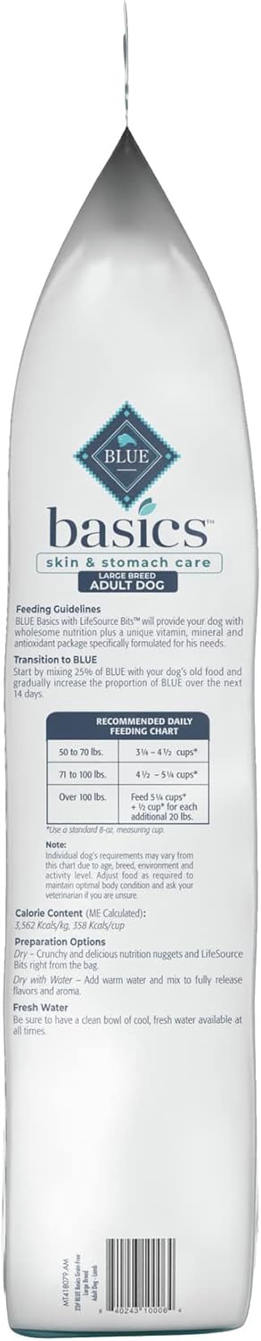 Contains: One (1) 22-lb bag of BLUE Basics Skin & Stomach Care Adult Large Breed Grain-Free Dry Dog Food, Lamb & Potato Recipe