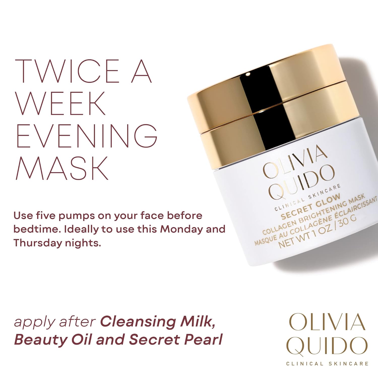 DAILY BEAUTY HABIT: Simply apply three pumps to your face at bedtime. We recommend you use this collagen brightening mask twice a week, 3 days apart. Alternate weekly with Secret Gold Mask for best results