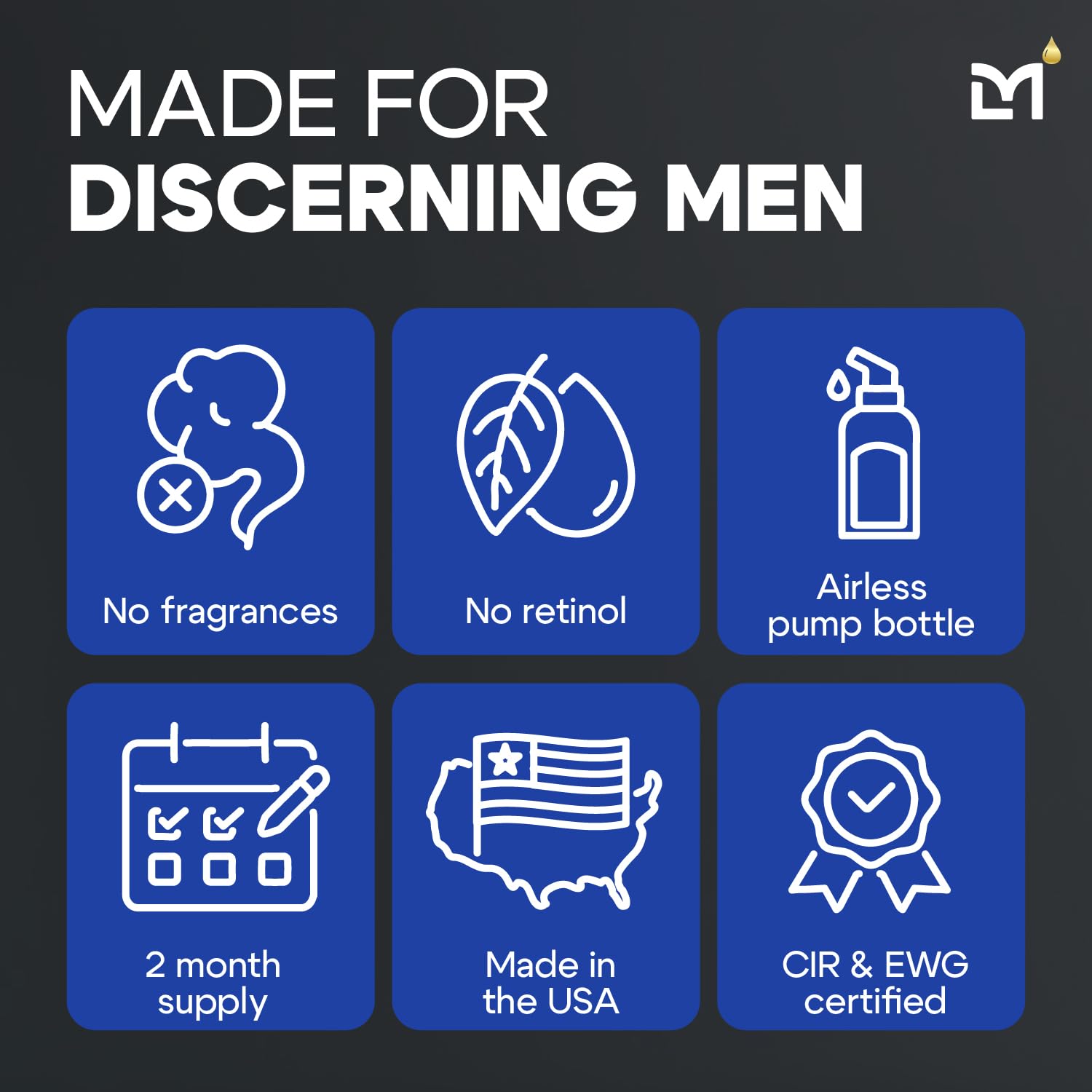 We focus on men’s specific skin needs with advanced formulations, rapid results, and a commitment to safety and quality. We use pharmaceutical-grade ingredients at clinically optimized concentrations for men’s skin.