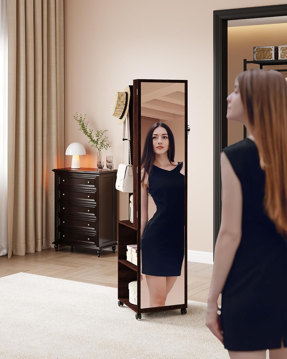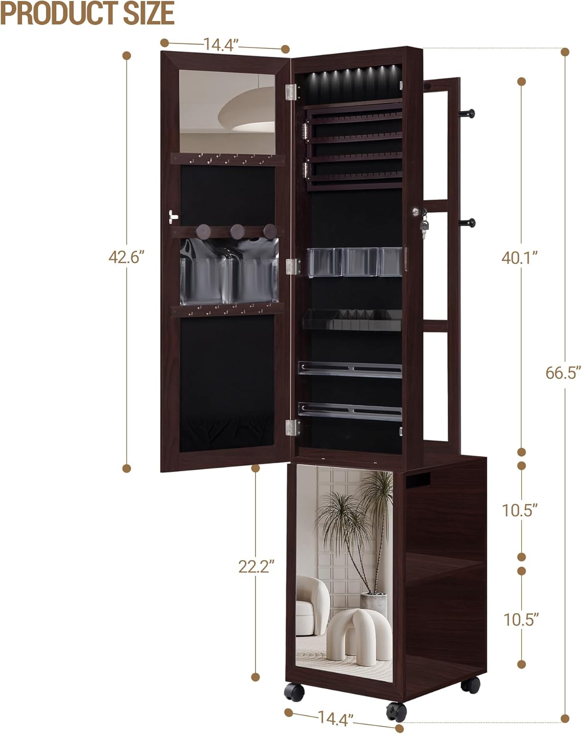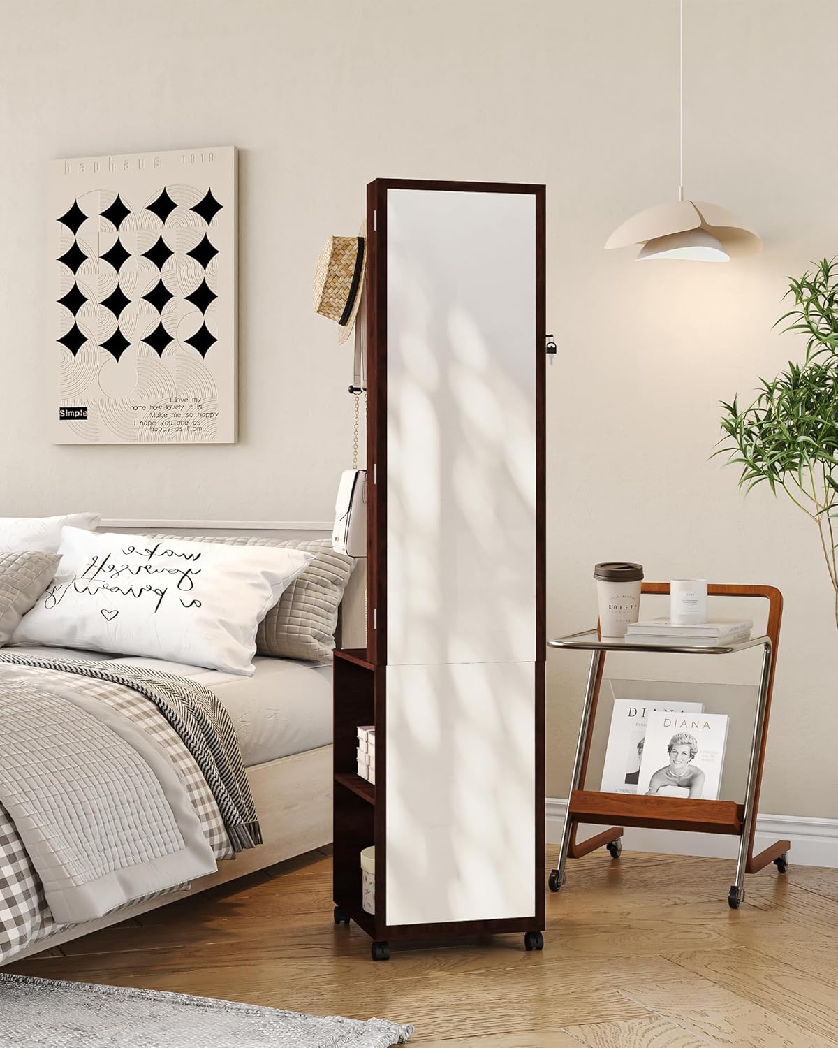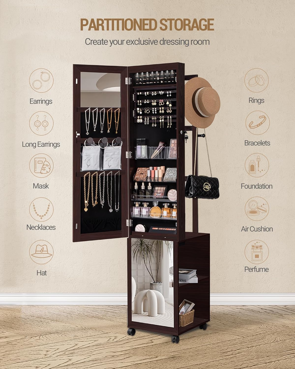 【5-in-1 Space Saving Solution】Get a jewelry organizer, full length mirror, bottom shoe mirror, vanity mirror, and 3-tier storage shelves, a garment rack, all in one stylish package. Finally, your jewelry, your makeup, your bags, your clothes have their own storage space in one place.