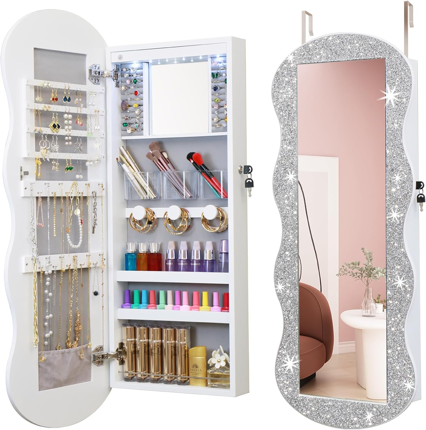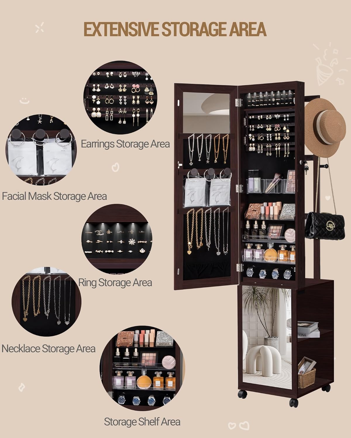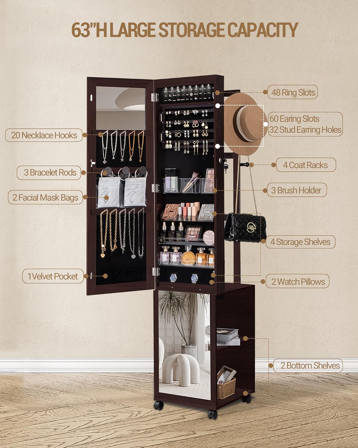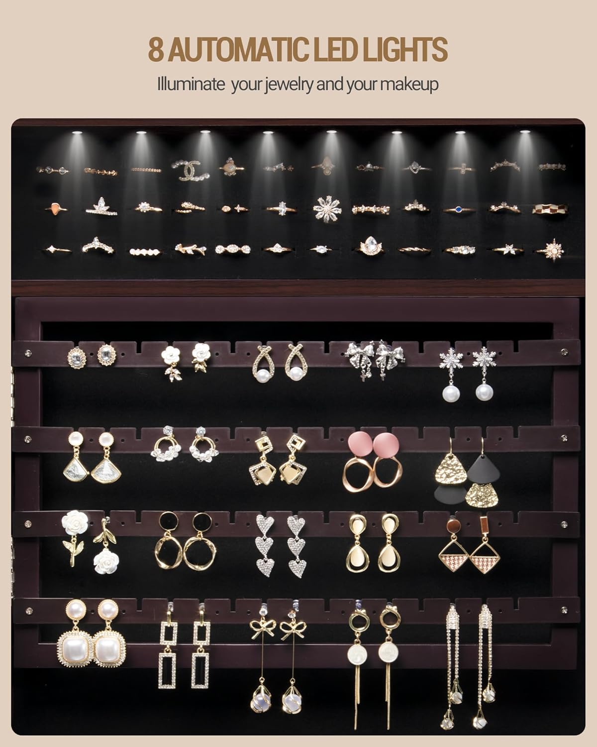 【Ample Storage Space】With 60 earring slots, 32 stud holes, 36 ring slots, 20 necklace hooks, 3 bracelet bars, 5 storage racks with acrylic lip sticks and brush storage boxes, 2 dust-proof storage pockets, and 1 black mask pockets. Our jewelry armoire provides plenty of space to keep all your jewelry organized and easily accessible.