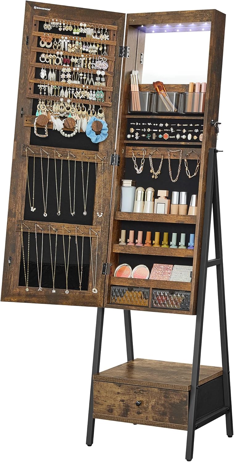 AKOZLIN Large 6-Tier Jewelry Box Organizer Functional Huge Lockable,5 Drawers Leather Jewelry Storage Case for Women Girls Ring Necklace Earring Bracelet Holder Organizer with Mirror Brown