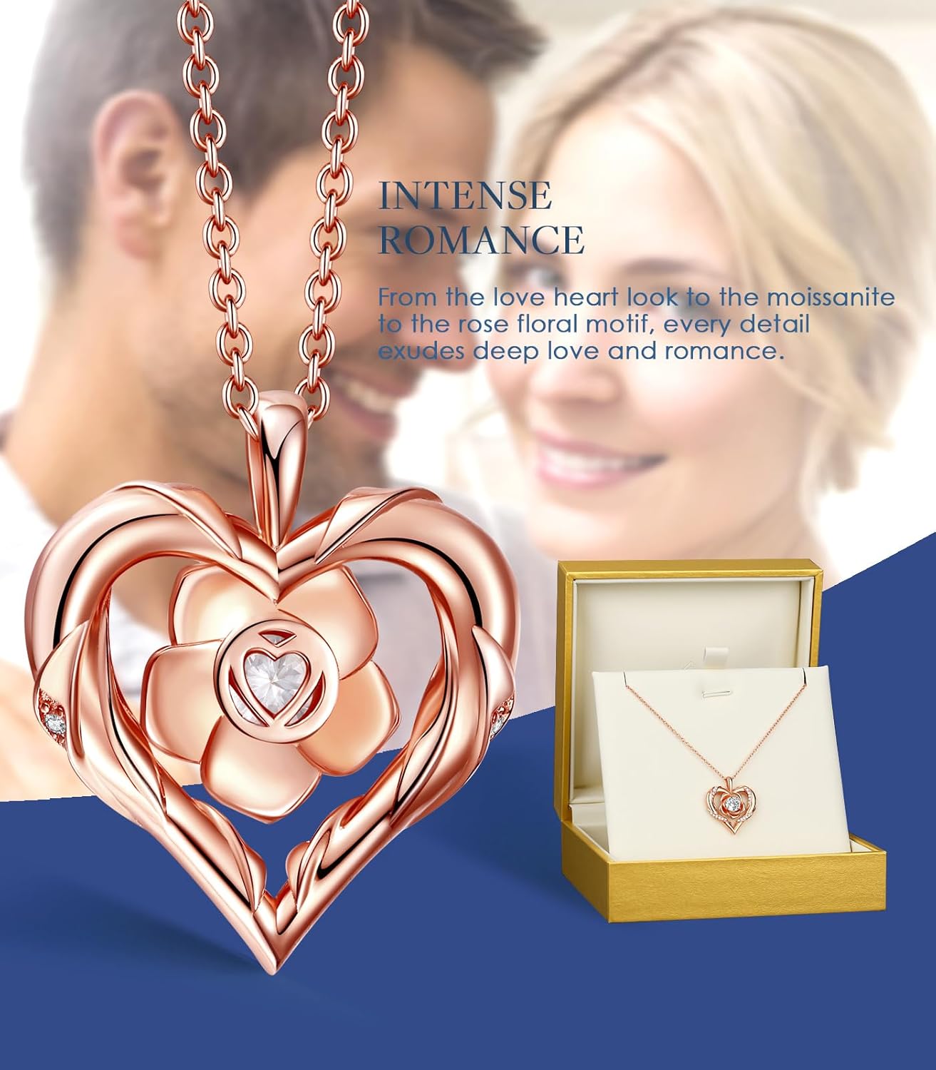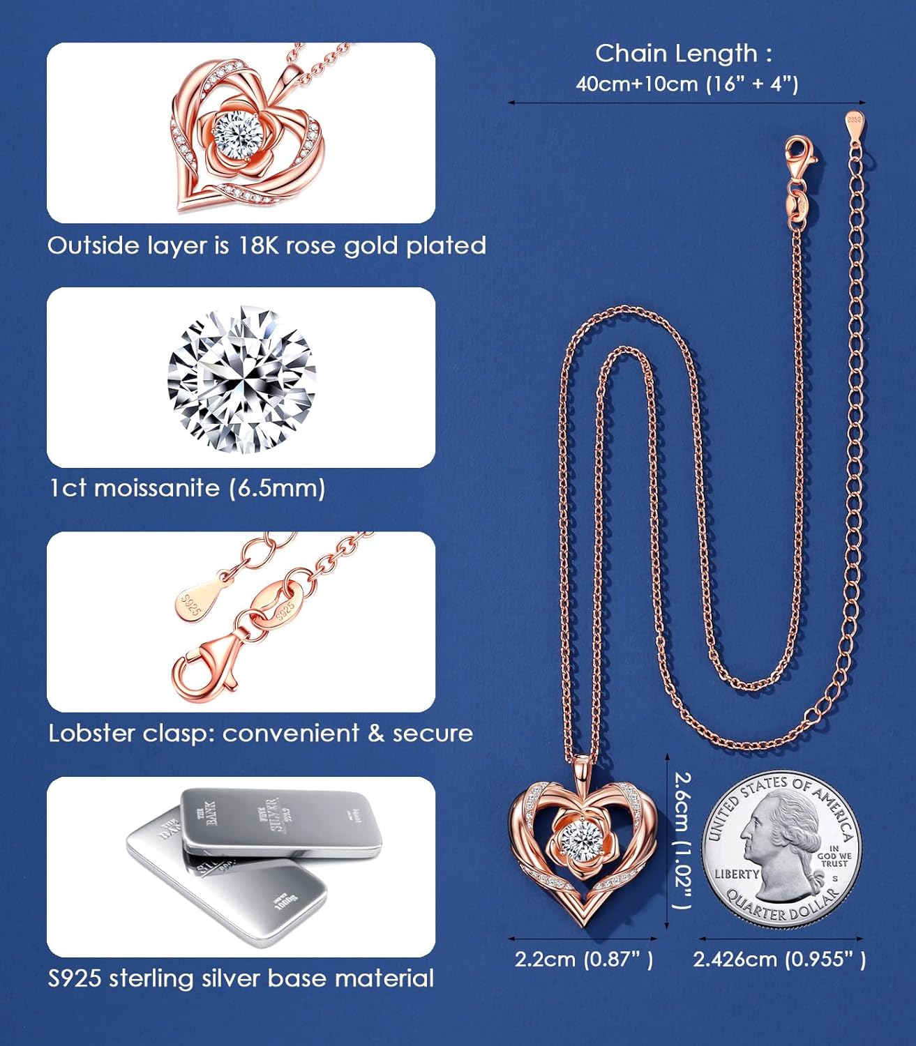 Beam & Bask Rose Flower Heart Moissanite Necklaces for Wife, S925 Silver Pendant for Women, 18K Gold Plated Jewelry for Her Girlfriend Mom for Anniversary Birthday