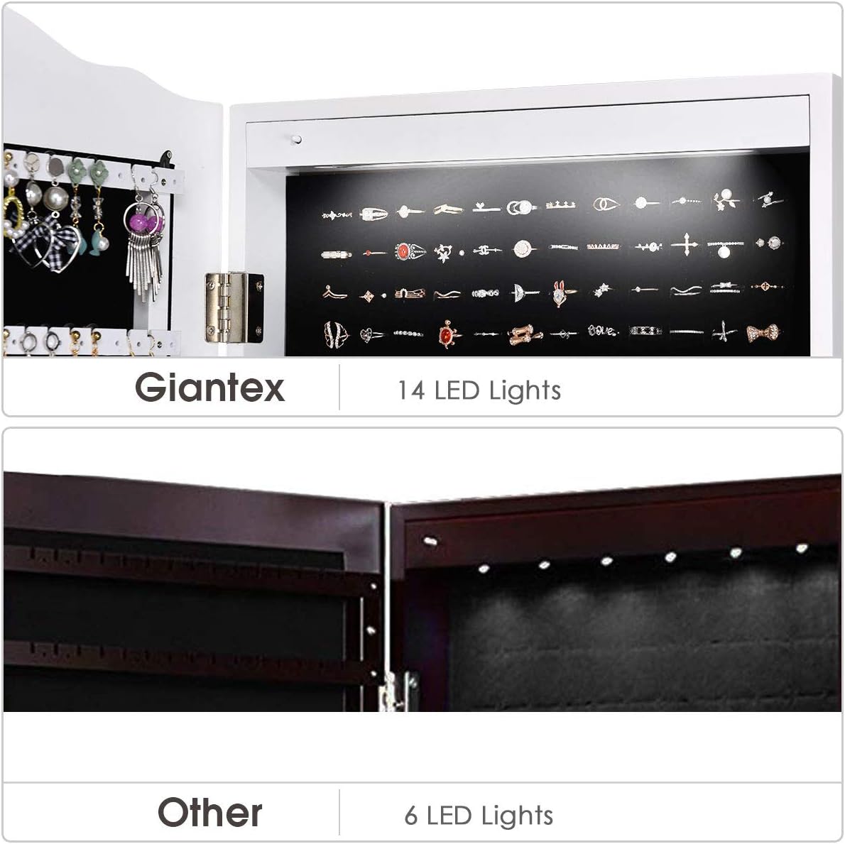 【Full Length Mirror & 14 Auto-ON LED】This jewelry cabinet is a combination of a full-length mirror and a jewelry cabinet. It can be used as a mirror for you to dress. It can also be used as a jewelry cabinet to store your daily jewelry. The auto-on LED lights are specially designed for you to pick up jewelry. (LED is powered by 3 AAA batteries, not included).
