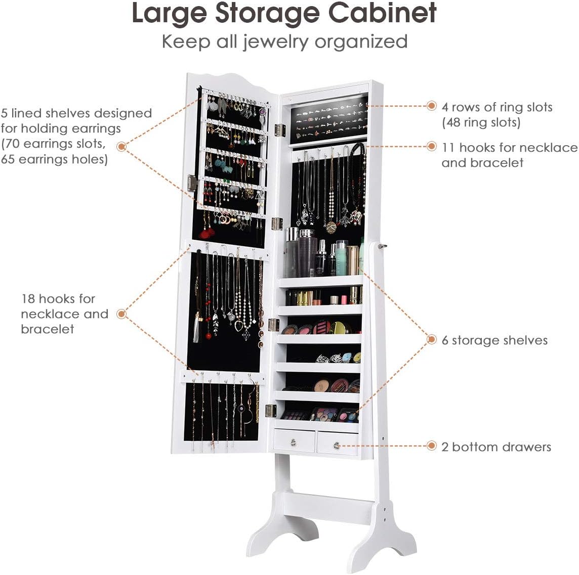 【Functional and Organized Storage Space】With 70 earring slots, 65 earring holes, 48 ring slots, 29 necklace hooks, 6 storage shelves and 2 drawers, this jewelry cabinet provides plenty storage space and keeps all the jewelry well organized.