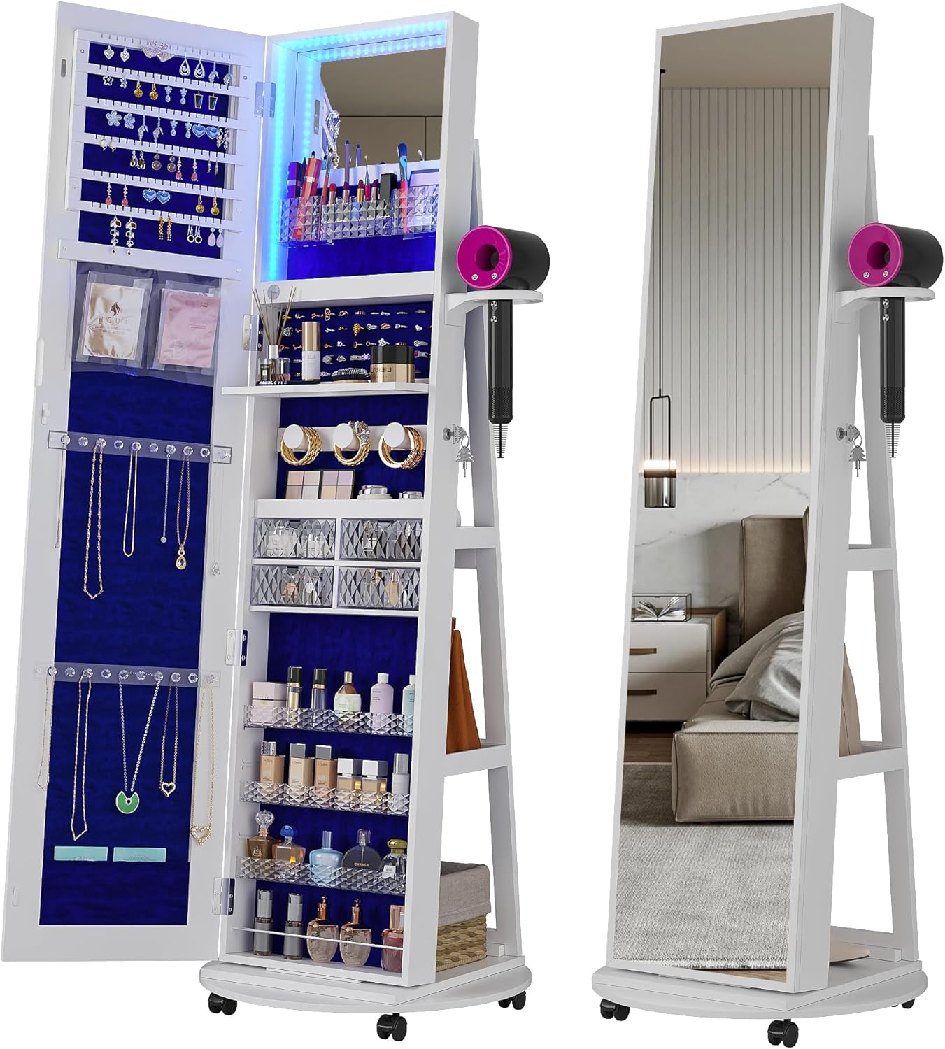 HNEBC 360° Swivel Jewelry Armoire with Mirror, LED Mirror Jewelry Cabinet Standing, Full Length Mirror with Jewelry Storage, Standing Jewelry Organizer/Lockable Wheels/Foldable Makeup Shelf (A-White)