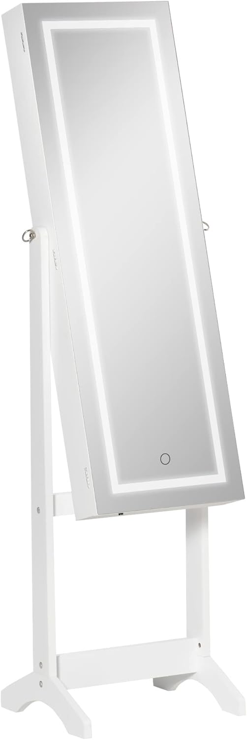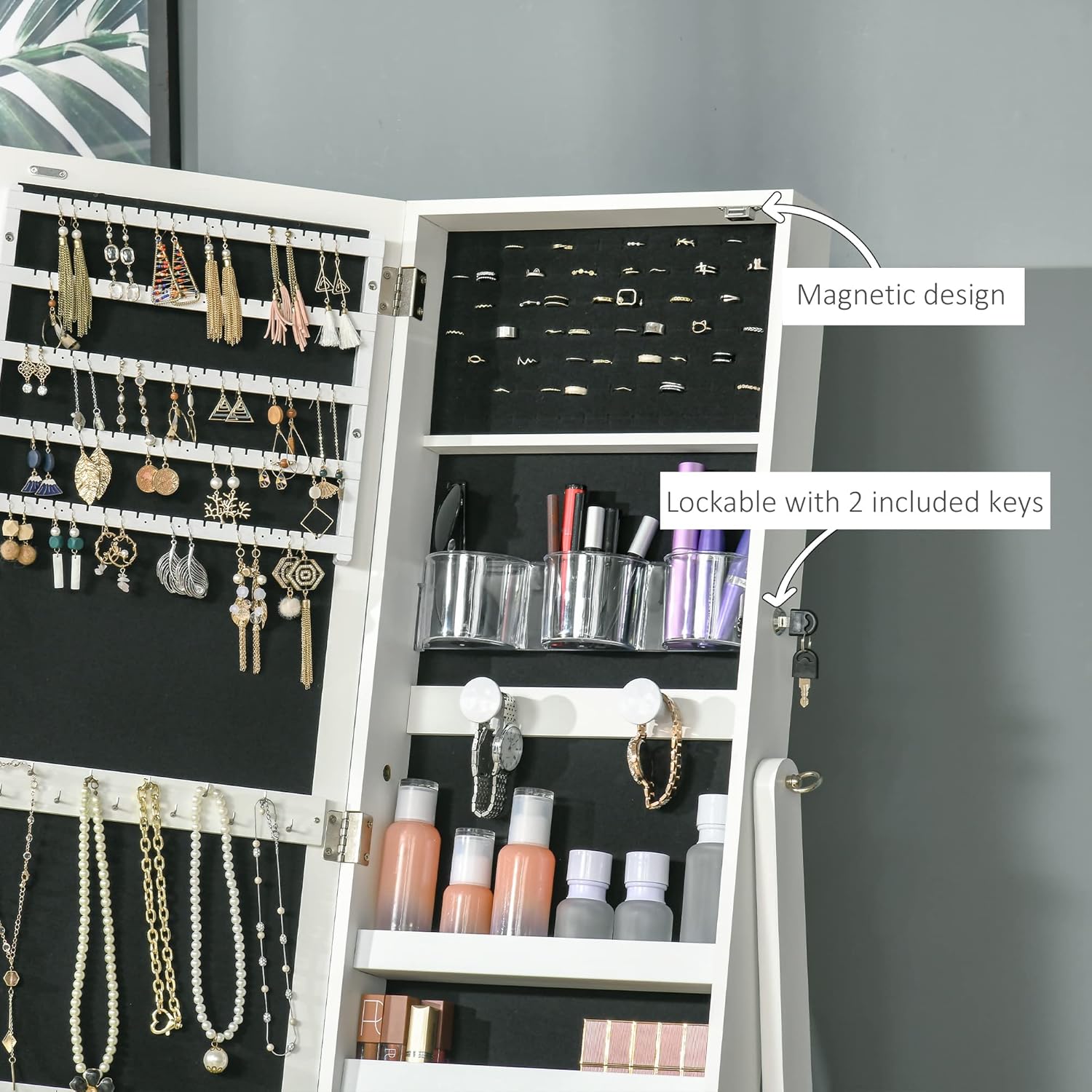 HOMCOM Floor Standing Jewelry Cabinet with LED Light, Lockable Jewelry Organizer with Full-Length Mirror, and 4 Adjustable Angles, White