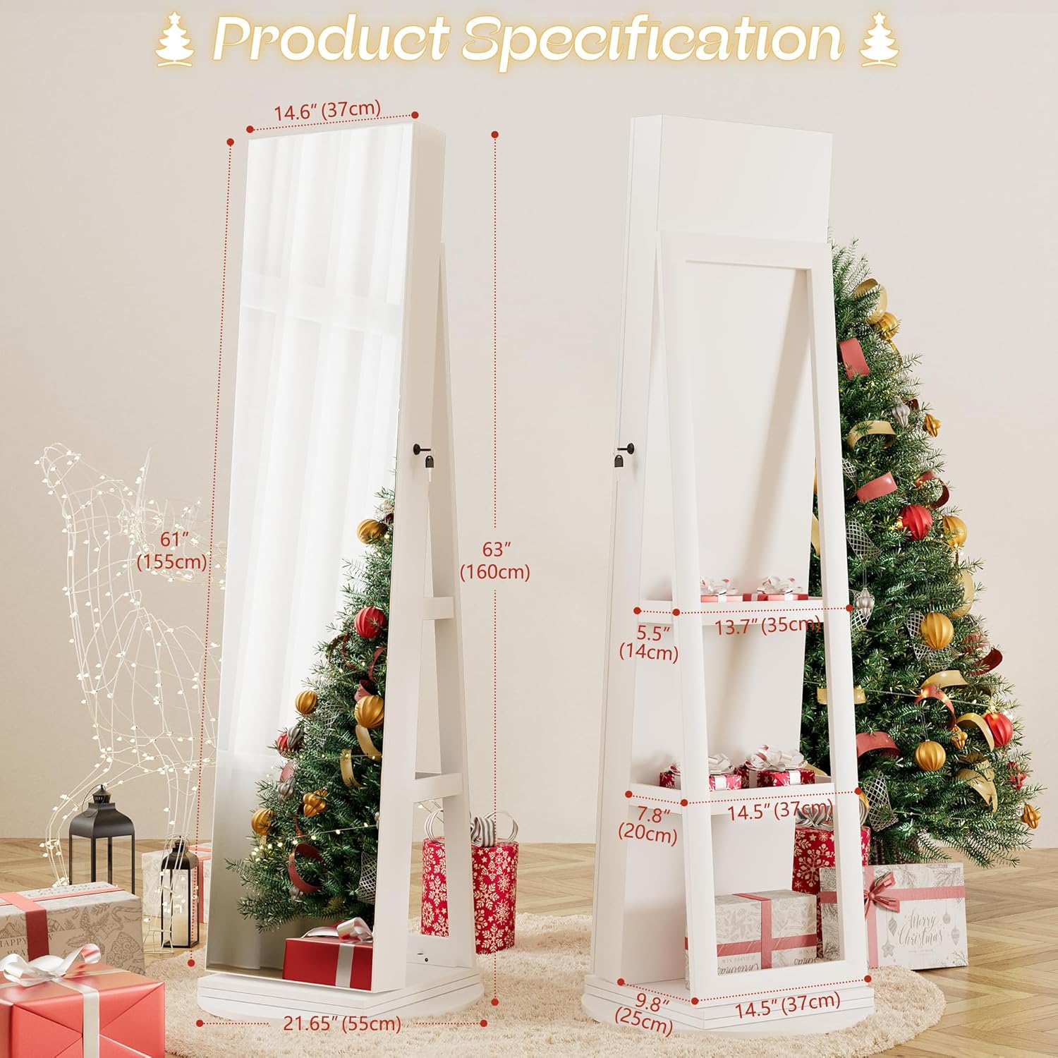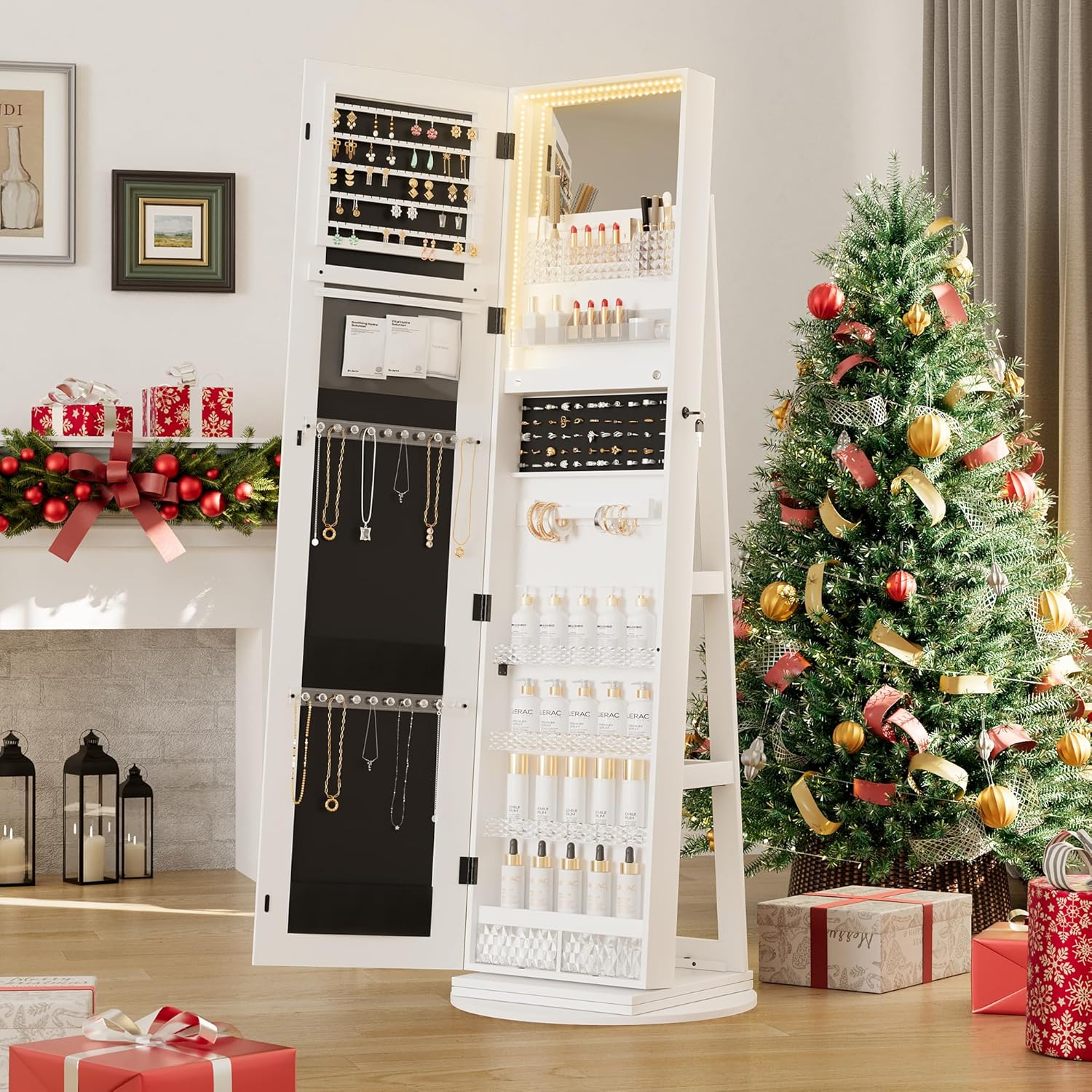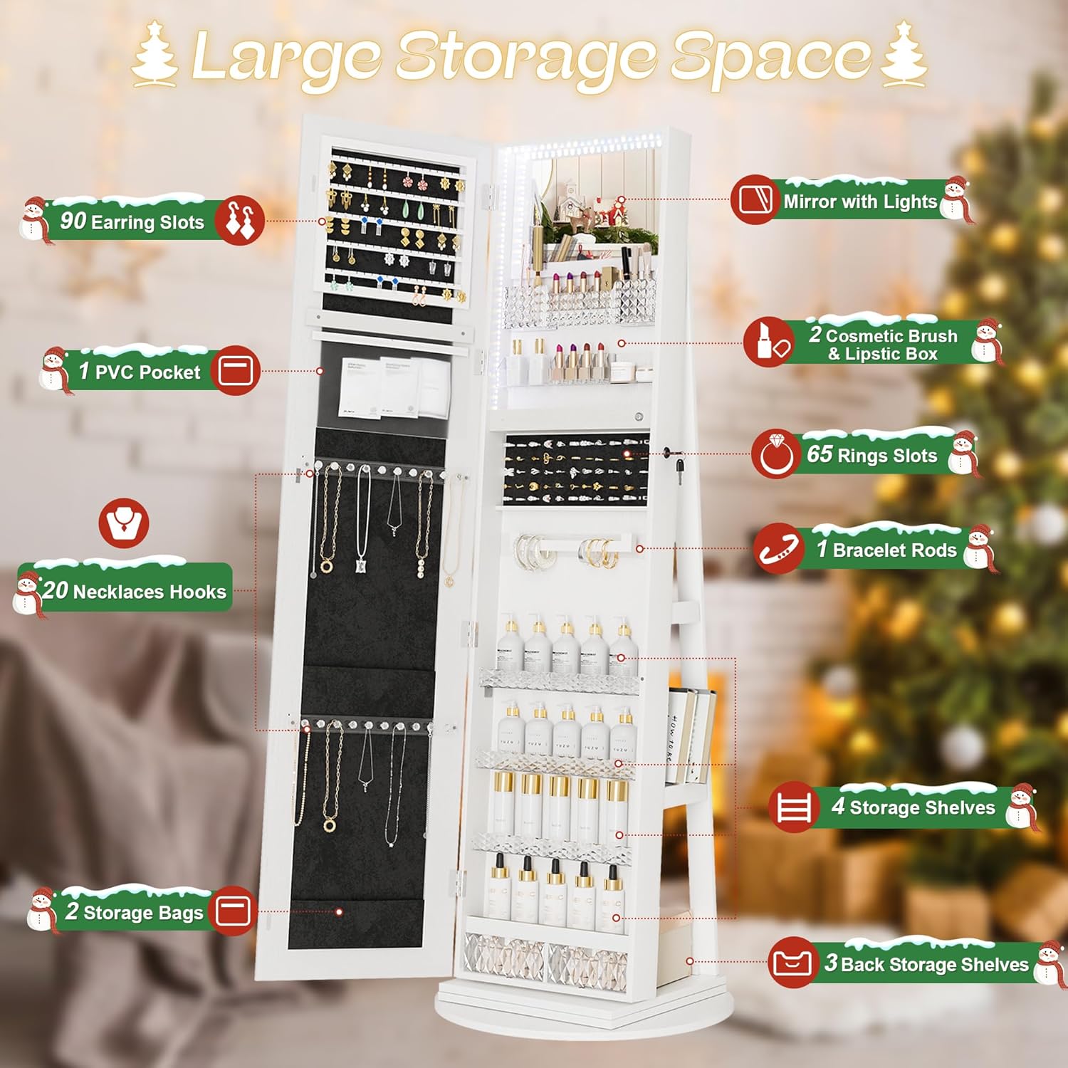 360° Rotatable Design & Convenient Rear Storage – With its innovative rotating function, this standing jewelry cabinet allows you to view your accessories from any angle while providing a rear storage rack for combs, bags, and other items