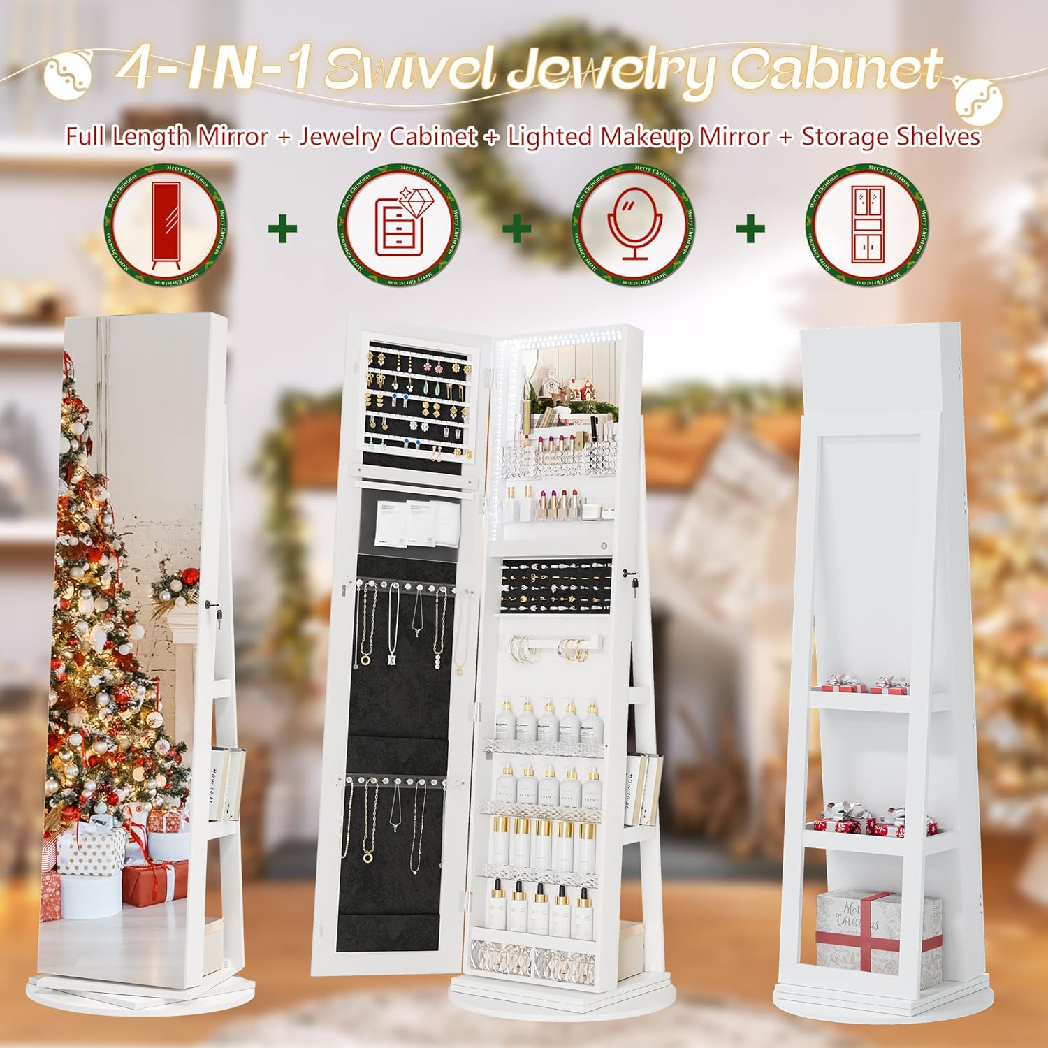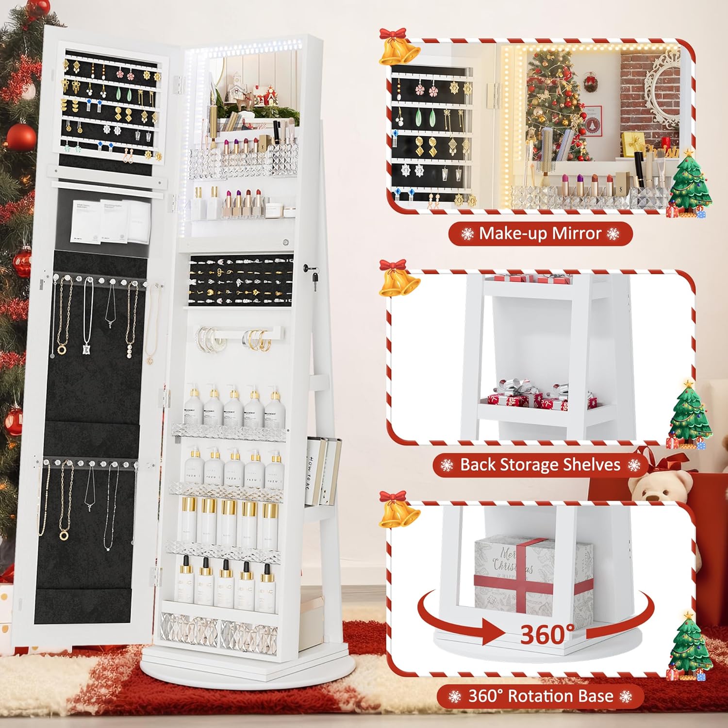 Mirror Jewelry Cabinet Standing, 360° Swivel Jewelry Armoire with 3 Color LED Lights, Lockable Jewelry Organizer with Storage Shelves