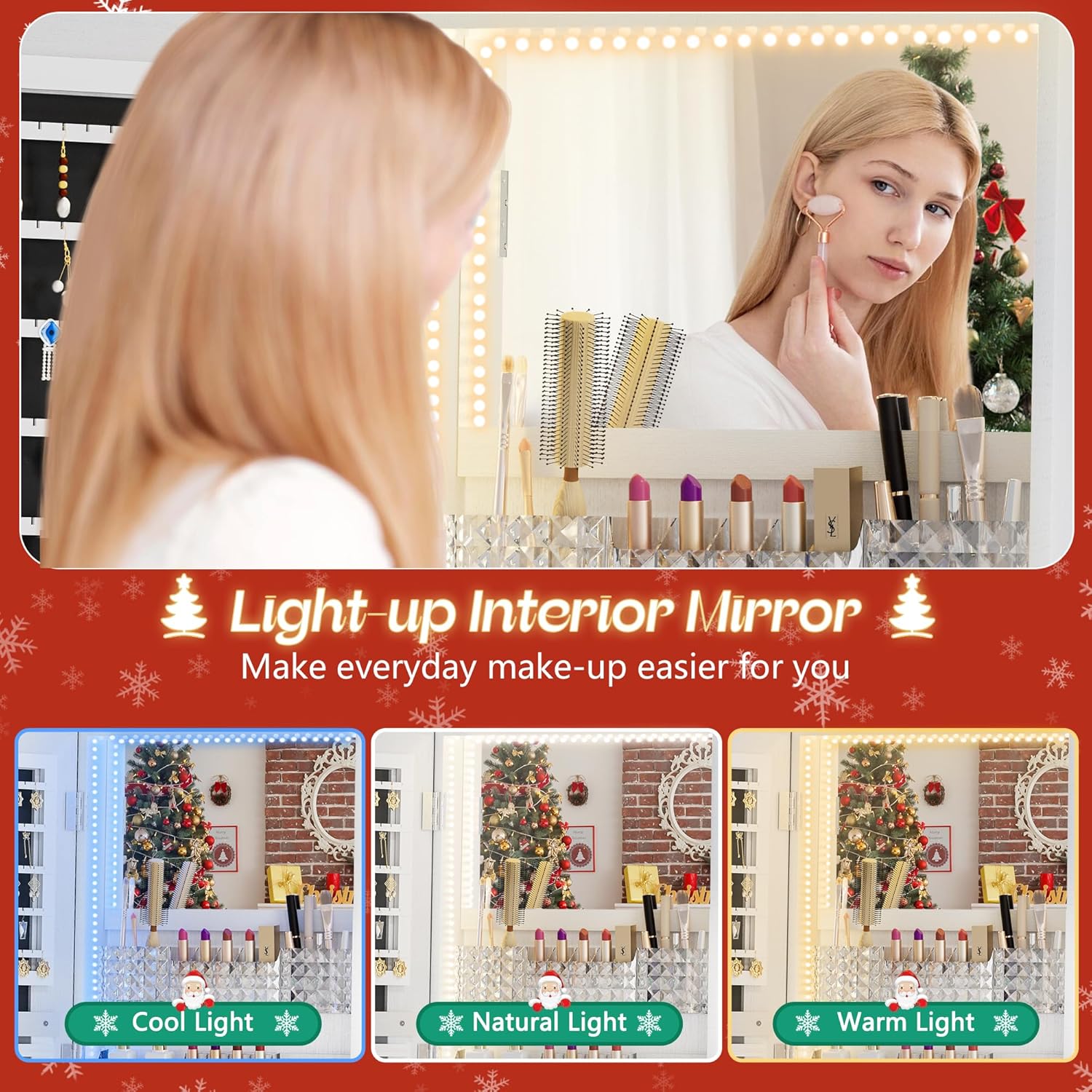 3-Colors LED Lights -This LED jewelry armoire features a built-in makeup mirror and 3-color dimmable fill light design, enhancing your comfort and style while getting ready