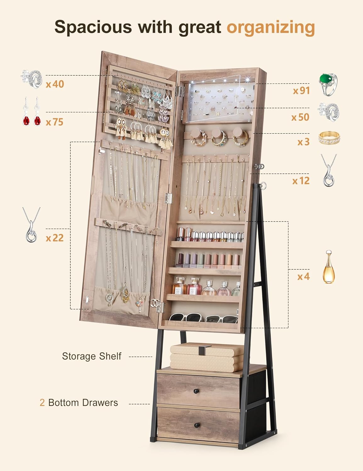 [Spacious Storage & Great Organizing] Nicetree Led Jewelry cabinet with mirror features two bottom drawers and one storage shelf for your larger items as face masks or travel bags for easy access, it is designed to end your mess and keep things organized.