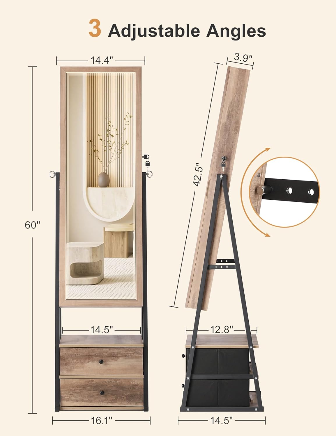 [Shatter-Proof HD Glass Mirror] Crafted with HD glass, Nicetree standing mirror with jewelry storage and its 3 adjustable tilt angles provide a perfect & clear head-to-toe view of outfit, and the explosion-proof film brings ultra protection at all times.