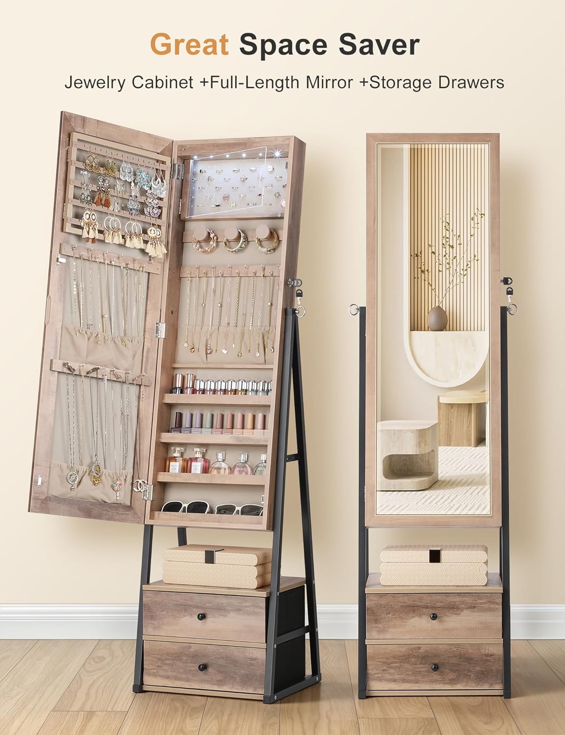 [3-In-1 Space Saver] Full-Length Mirror + Large Capacity Jewelry Cabinet +2 Storage Drawers , its reasonable layout & thoughtful design will absolutely satisfy your every-growing storage needs.