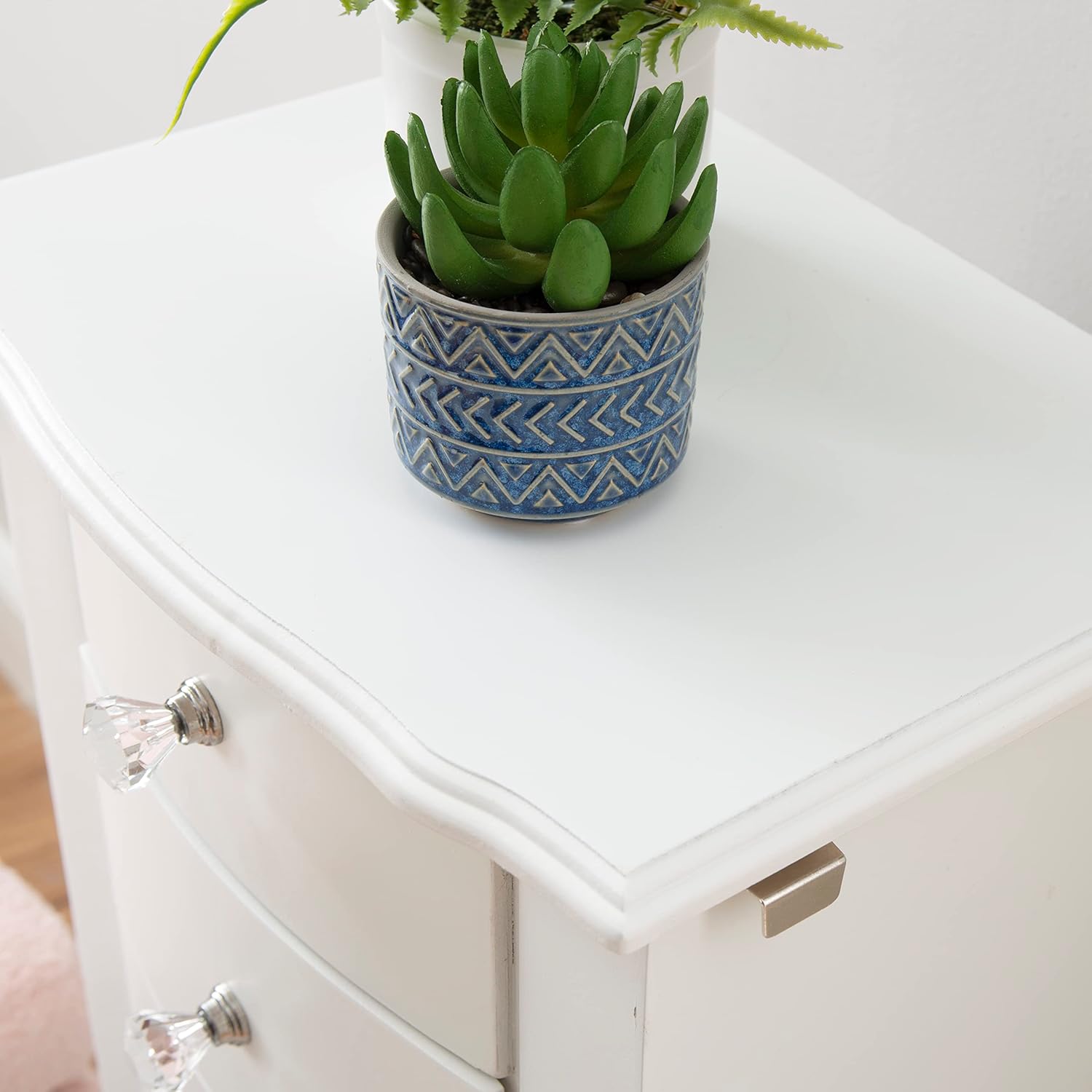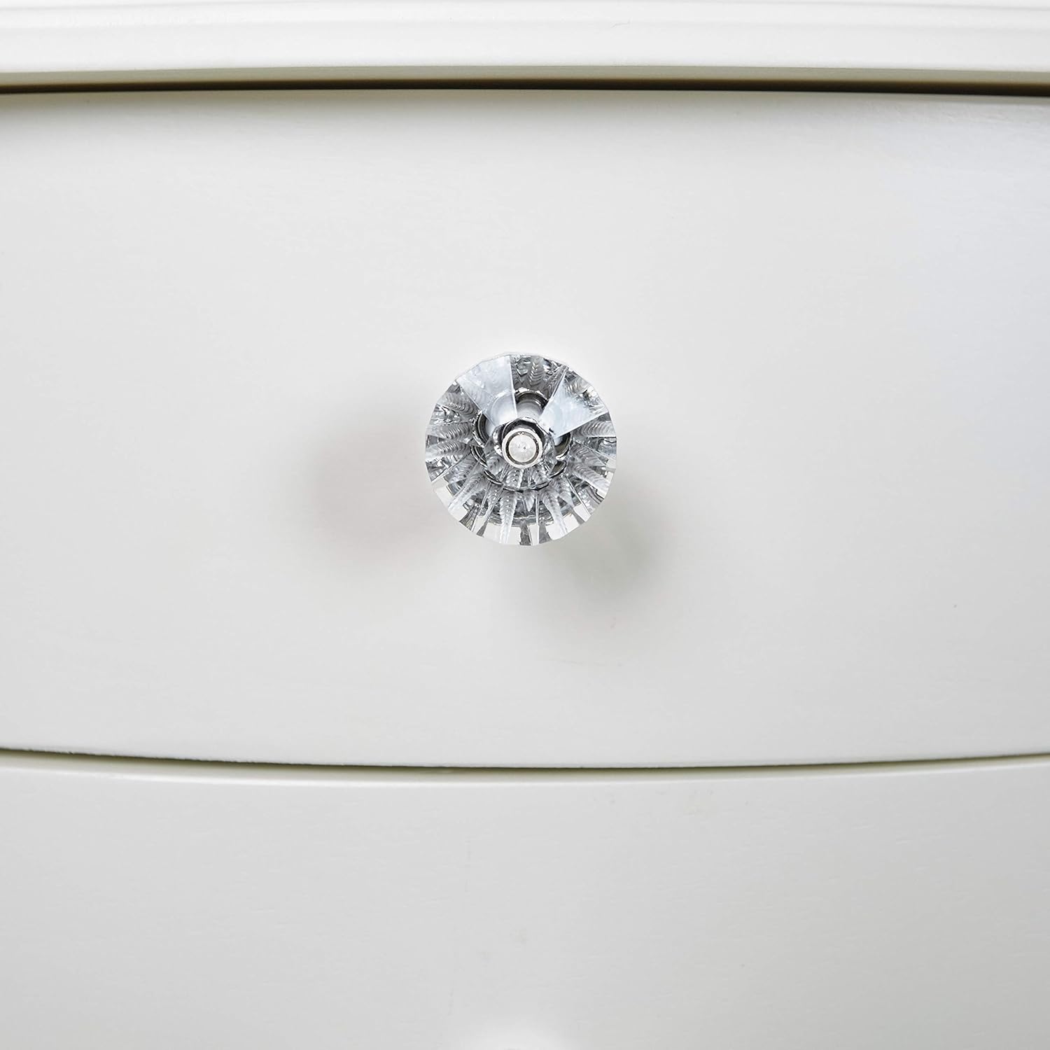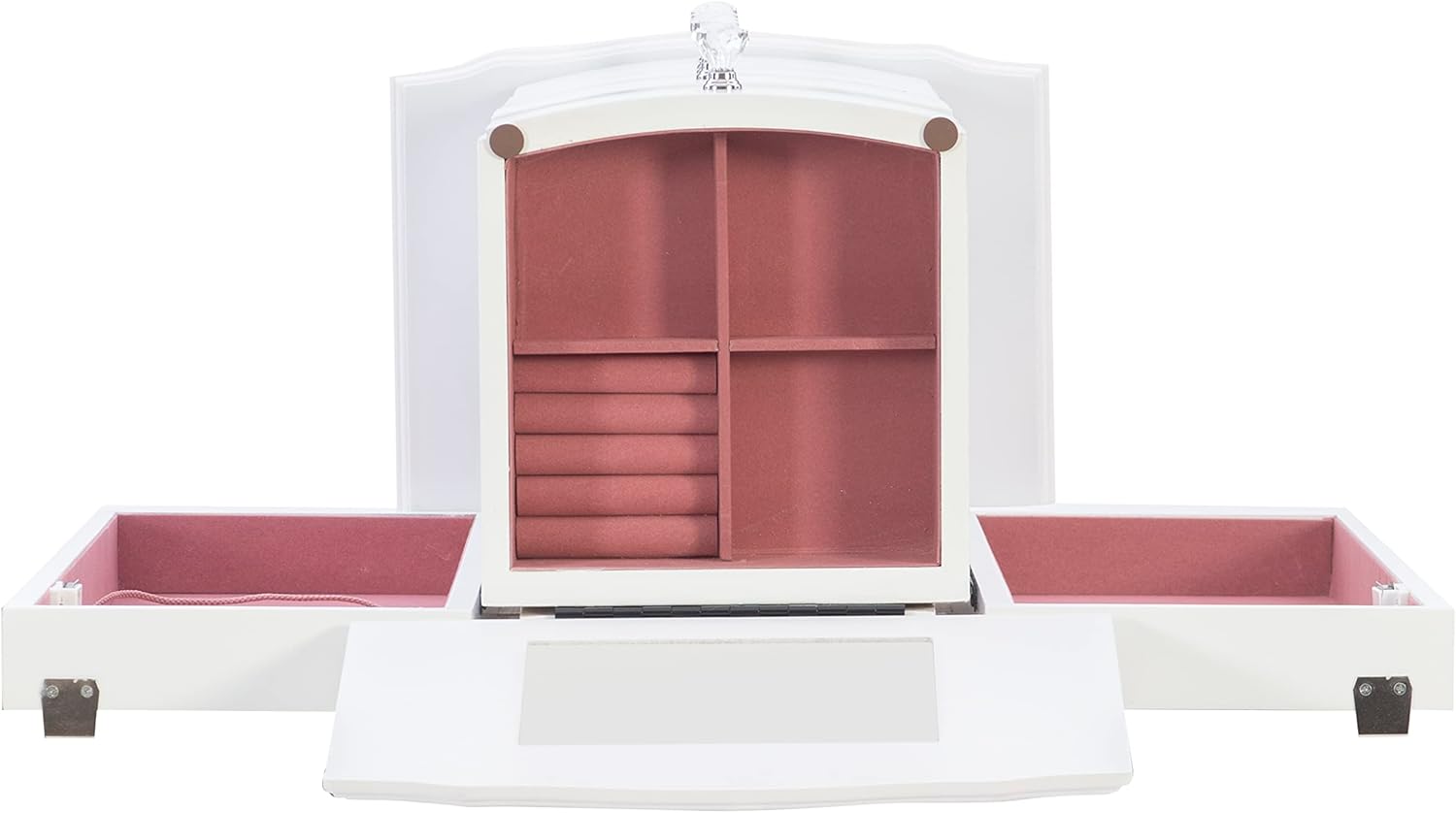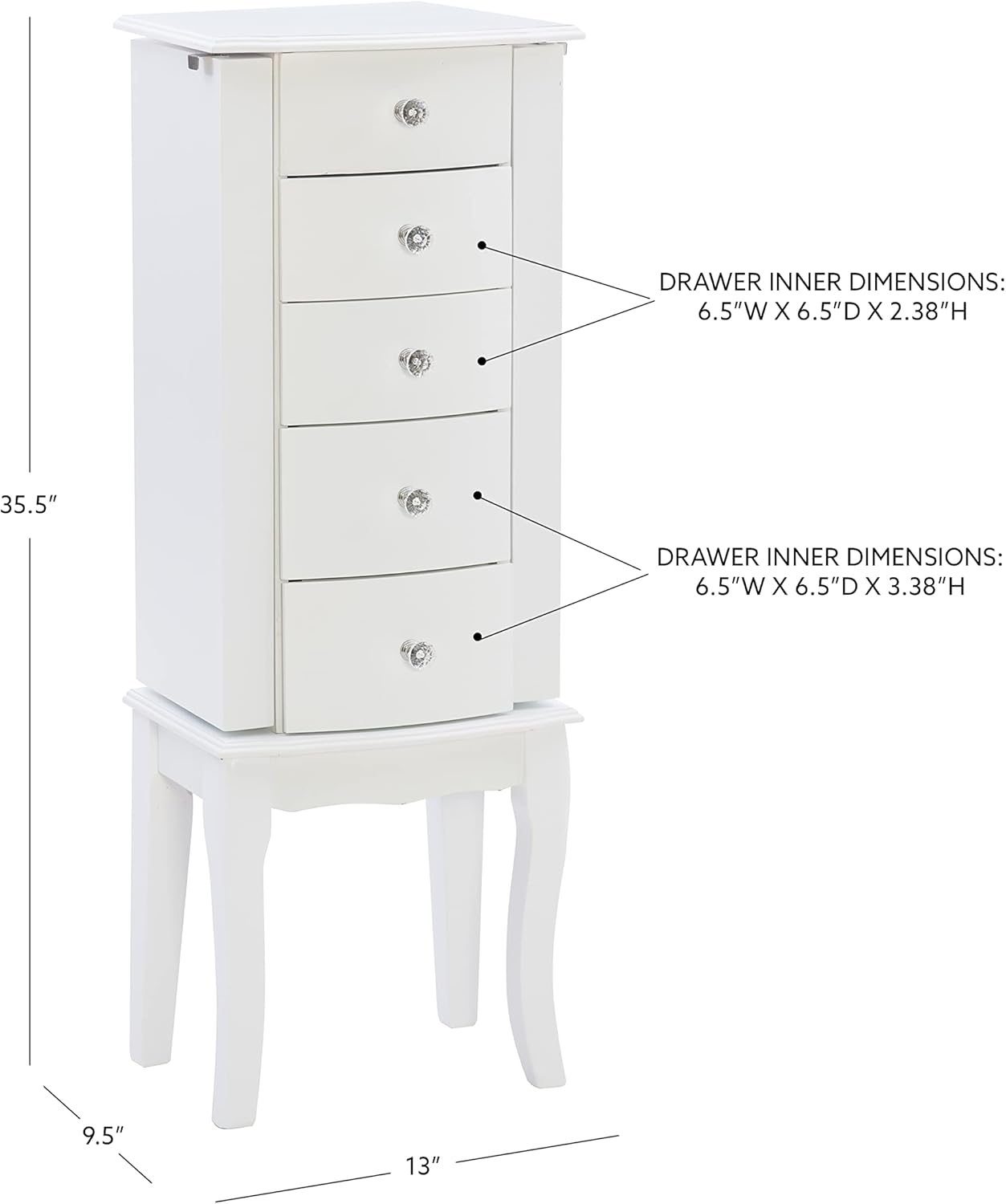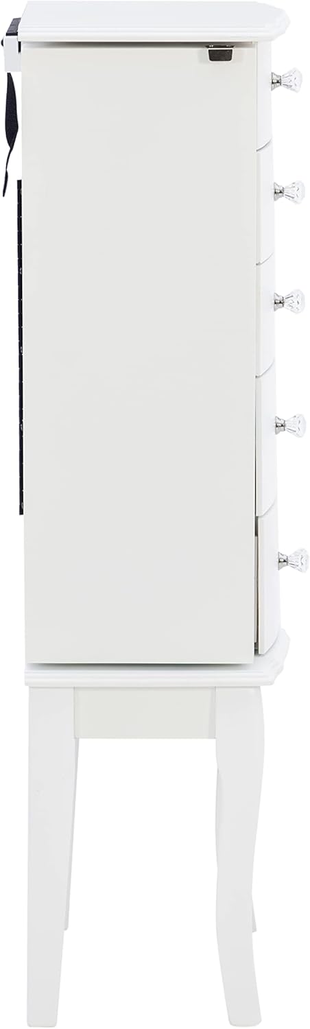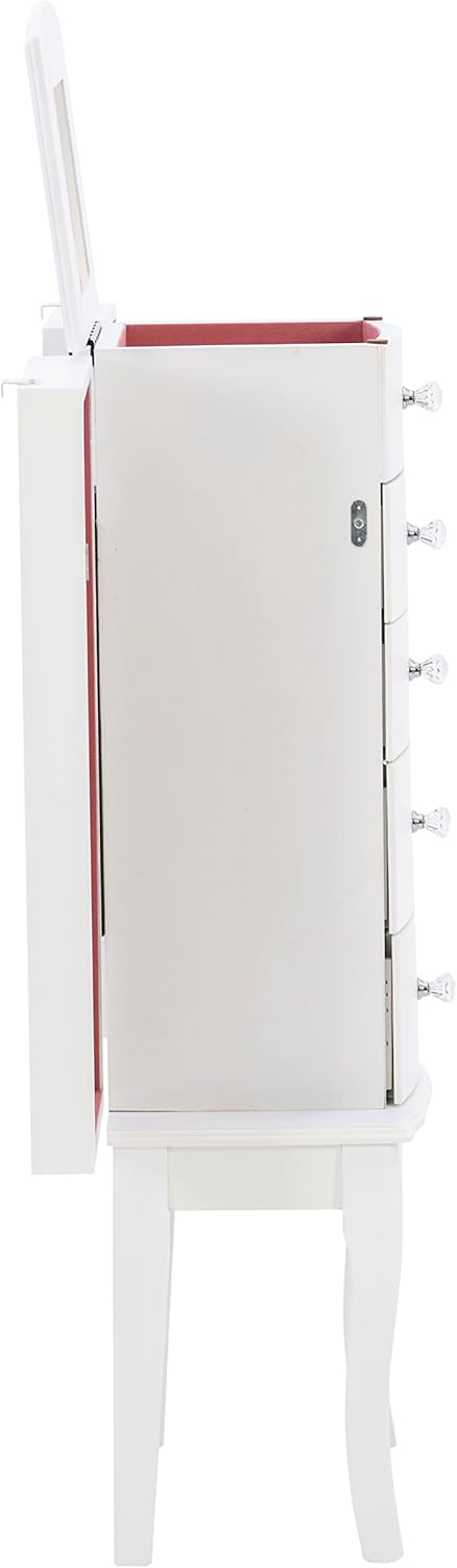 The petite White finished jewelry armoire is accented with beautiful clear faceted drawer pulls and parsons-style curved legs. Scalloped top and front apron and curved drawers add continental details. Sized for economy and function, this jewelry armoire is the perfect piece to store all of your beloved treasures. Top opens up, side doors open wide and deep drawers pull out to provide ample storage. Inside features plush pink lining. Some assembly required.