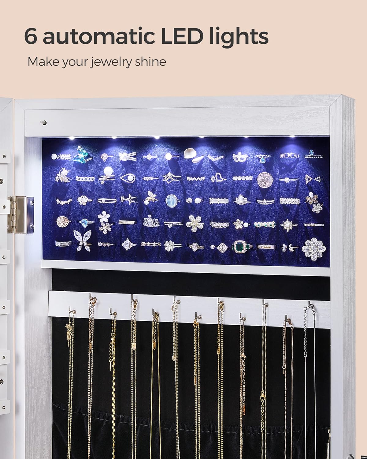 [Auto LED Lights] The 6 LED lights inside the cabinet emit cozy, soft lighting when you open the cabinet door, helping you pick out the right jewelry easily without waking up your loved one (the LED lights are powered by 3 AAA batteries, not included)