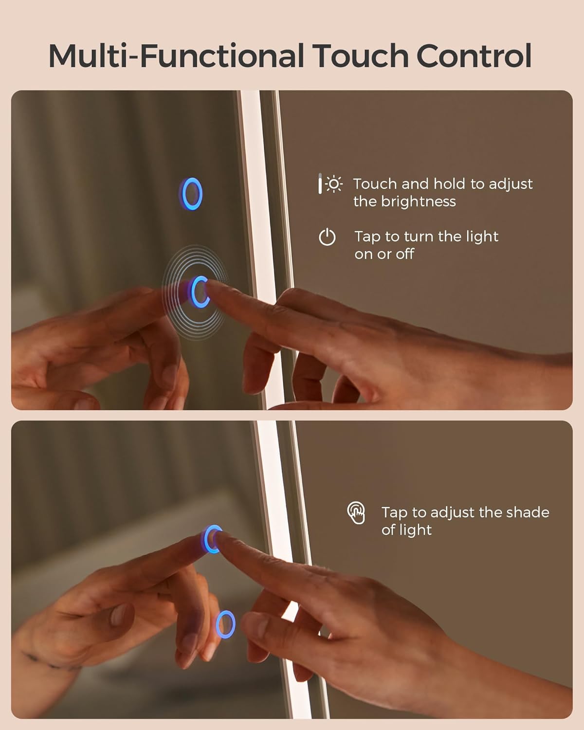 [Full-Length Mirror with Adjustable LED Lights] This non-rotatable jewelry cabinet boasts a full-length mirror with dimmable LED lights that have 3 shades of light and a smart memory function—you can use the touch button to find the perfect lighting to check your look