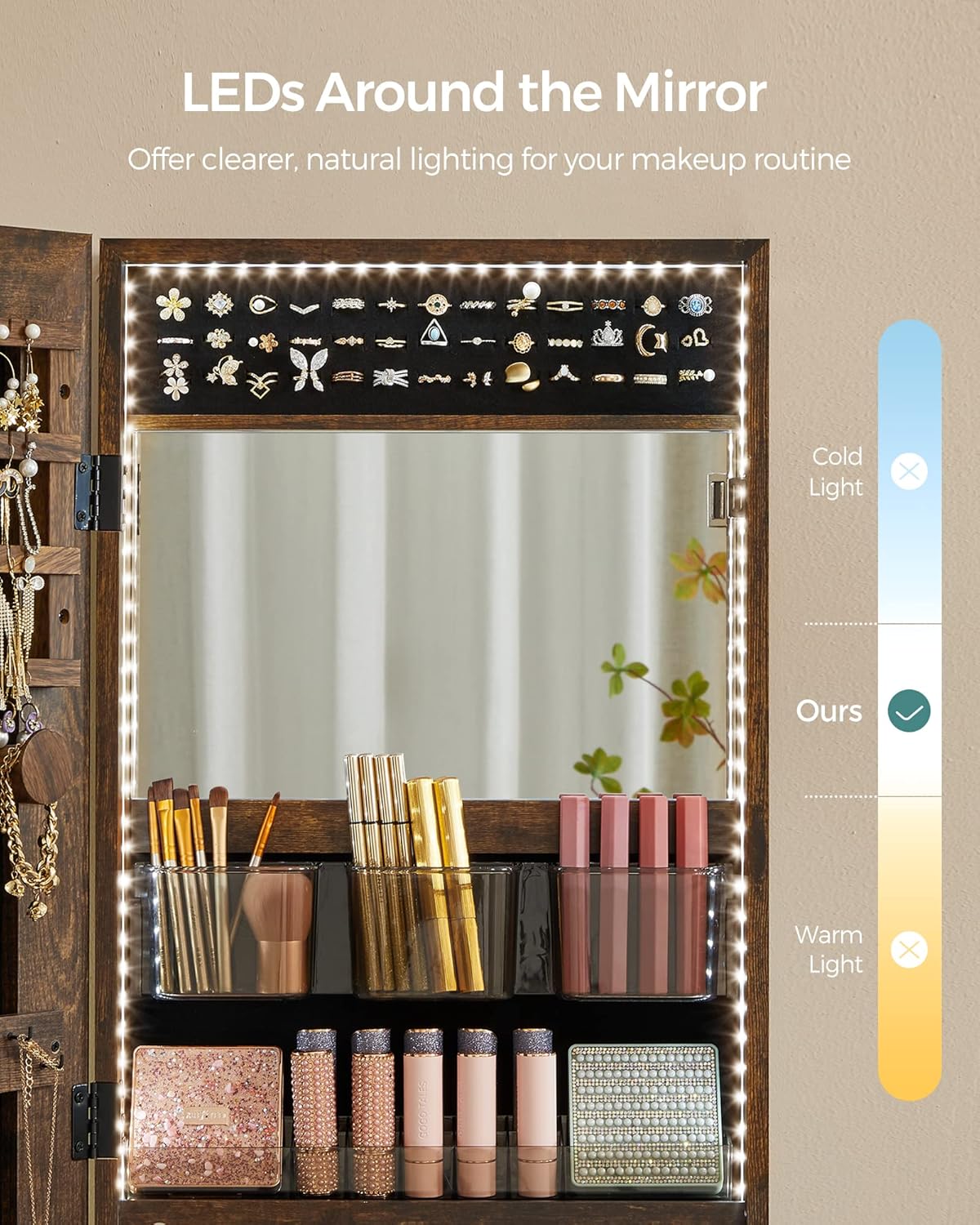 Lighted Mirror Inside, Super Handy: The LED lights illuminate the area surrounding the interior mirror when you open the door of the jewelry cabinet, making a light-up vanity for you to apply your makeup and put on jewelry with ease